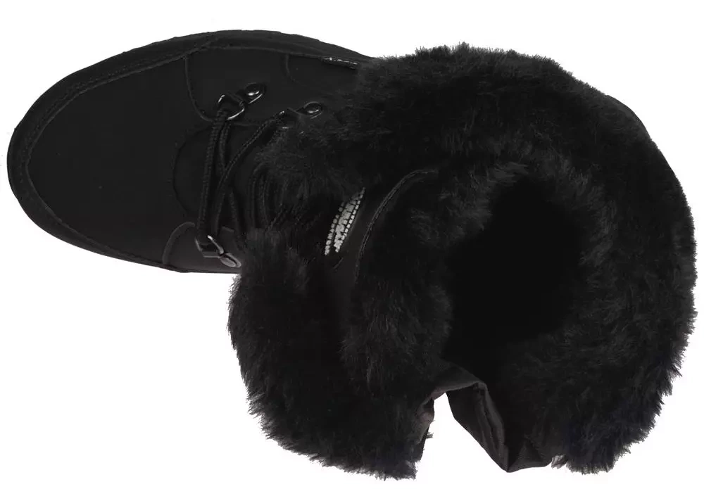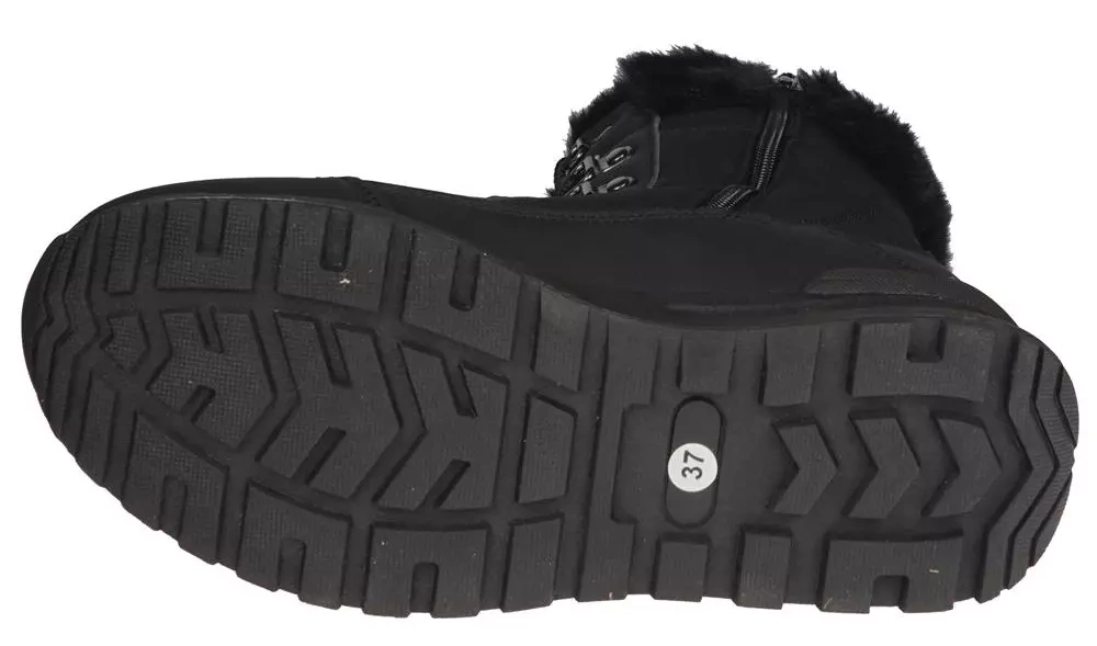 Zimowe buty damskie Firmy American Club w kolorze czarnym z ciepłym kożuchem. Obuwie za kostkę jest solidne, wygodne i ładnie się prezentuje. Buty zostały wykonane z materiałów wysokiej jakości, posiadają cholewkę Softshell, która chroni przed niską temperaturą, wiatrem, deszczem oraz śniegiem. Dodatkowo, wodoodporna membrana Tripletex posiada zaawansowane właściwości odprowadzania wilgoci. Wysokie buty softshell posiadają grubą podeszwę z bieżnikiem, która dba o dobrą przyczepność do podłoża oraz zapobiega przed ślizganiem. Wnętrze obuwia zimowego jest ocieplane miękkim kożuchem co zapewni odpowiednią temperaturę nawet podczas zimowych dni. Zamek usprawnia proces zakładani i ściągania a wiązanie pozwala na idealne dopasowanie. Czarne buty zimowe są praktyczne i łatwe w utrzymaniu czystości, a ciepły kożuch nie tylko zapewnia ciepło ale również jest elementem ozdobnym. Ocieplane obuwie damskie sprawdzi się w jesienne oraz zimowe dni do codziennego użytku czy też w górskie wyprawy.