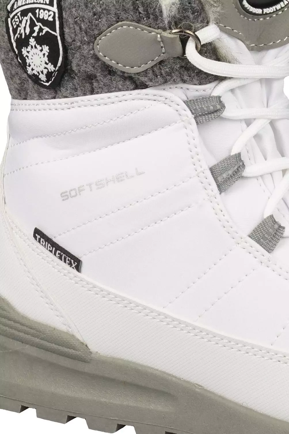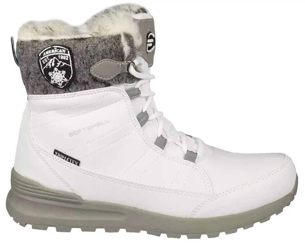 - Białe zimowe buty damskie za kostkę Firmy American Club Wysokie obuwie posiada cholewkę Softshell oraz wodoodporną membranę Tripletex. Białe obuwie wysokiej jakości jest idealne na jesienne oraz zimowe dni.