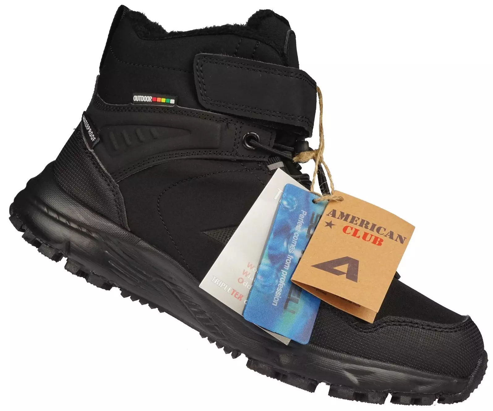 - Zimowe, ocieplane buty młodzieżowe Firmy American Club w kolorze czarnym. Obuwie za kostkę idealne w wyprawy górskie lub do codziennego użytku. Buty softshell chronią przed zimnem i wiatrem, a wodoodporna membrana Tripletex utrudnia dostawaniu się wody.