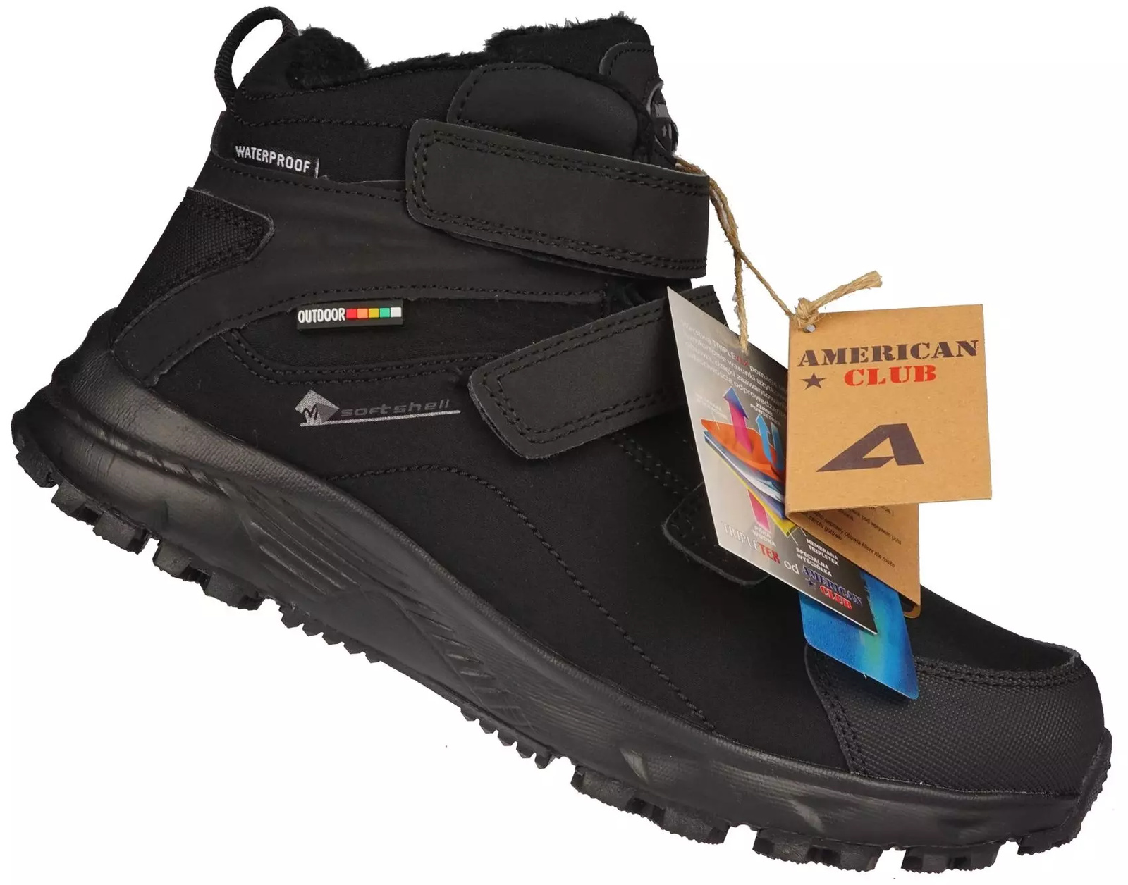 - Zimowe, ocieplane buty młodzieżowe na rzepy American Club w kolorze czarnym. Obuwie górskie za kostkę sprawdzi się również do codziennego użytku. Buty softshell chronią przed zimnem i wiatrem, a wodoodporna membrana Tripletex zabezpiecza przed wodą.