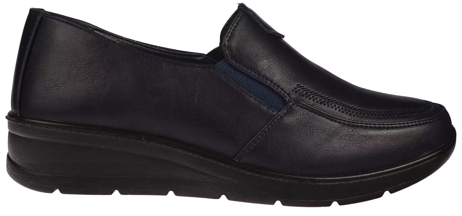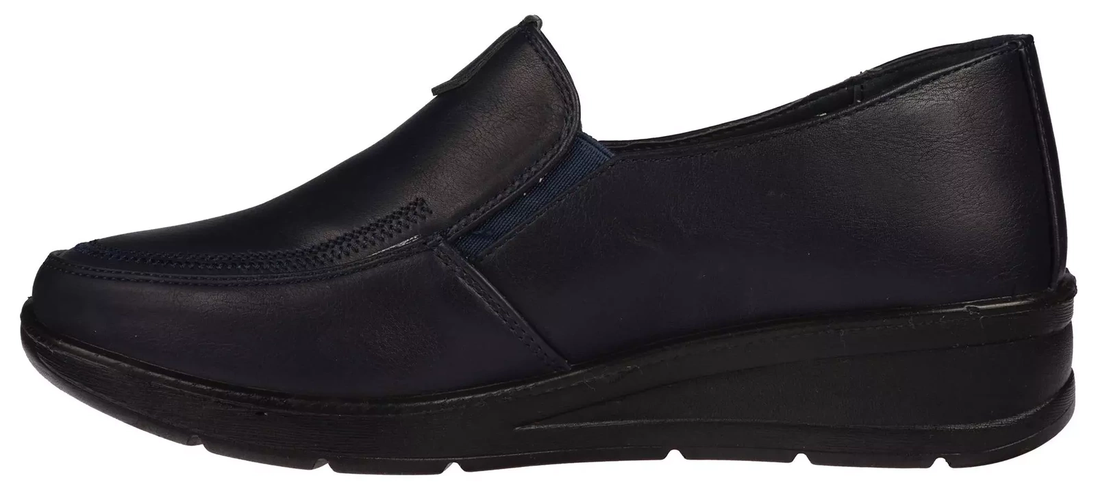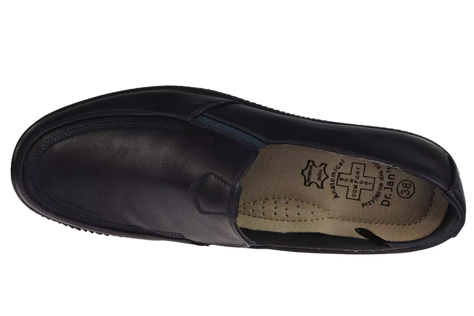 Półbuty damskie Firmy Dr. Jan wykonane z miękkiej ekoskóry w kolorze granatowym. Obuwie posiada wkładkę ze skóry naturalnej, która jest przyjazna dla stopy i zapewnia wysoki komfort użytkowania. Buty damskie mają lekki koturn wykonany z pianki, który dodaje kilku centymetrów. Materiał z jakiego został stworzony czyni produkt bardzo lekkim. Dodatkowo, skórzane półbuty posiadają gumy, które ułatwiają zakładanie i idealne dopasowanie do stopy. Prosta konstrukcja została urozmaicona ozdobnymi przeszyciami, które dodają elegancji. Półbuty damskie Dr. Jan są idealnym wyborem na co dzień, a wysoka jakość gwarantuje komfort użytkowania i wielosezonowość.