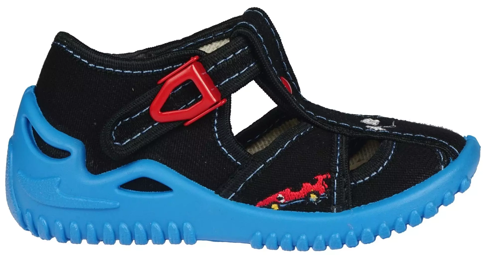 Tenisówki dziecięce firmy ZETPOL w czarnym kolorze z białym haftem, czerwoną zapinką i niebieską podeszwą . Cholewka bucików przedszkolnych wykonana z materiałów tekstylnych wysokiej jakości, a wnętrze z naturalnej tkaniny bawełnianej. Tenisówki chłopięce posiadają skórzaną wkładkę, która jest wzbogacona o aktywny węgiel pochłaniający nieprzyjemne zapachy oraz dziurki poprawiające wentylację i zapobiegające nadmiernemu poceniu się stopy. Dodatkowo podeszwa została wykonana z bezftalanowego tworzywa, oznacza to że tenisówki są produkowane bez użycia ftalowanych związków plastyfikujących. Zapewnia to bezpieczeństwo dla Twojego dziecka. Tenisówki do przedszkola są staranni wykonane oraz mają ciekawą grafikę nawiązującą do wyścigów samochodowych. Głównym celem firmy Zetpol jest wygoda i komfort dla dziecka. Obuwie posiada certyfikat C.L.P.O "Dobre Buty". Tenisówki dziecięce z półotwartym noskiem i elastyczną podeszwą są lekkie i wykonane ergonomicznie. Wysoka jakość obuwia gwarantuje trwałość oraz komfort użytkowania. Idealne obuwie do przedszkola czy szkoły.