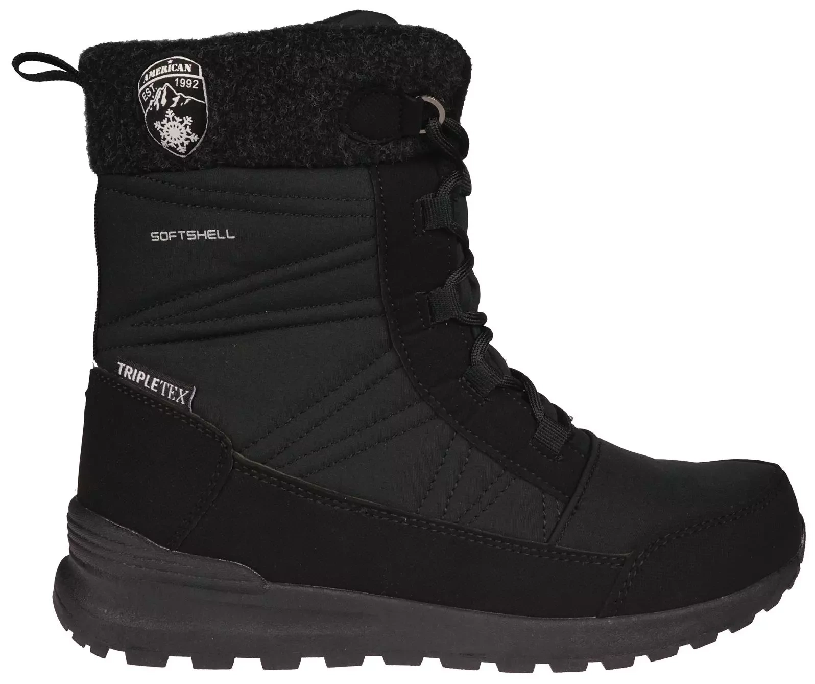 - Zimowe buty damskie Firmy American Club w kolorze czarnym. Posiadają cholewkę Softshell która chroni przed niską temperaturą, wiatrem, deszczem oraz śniegiem. Dodatkowo posiadają wodoodporną membranę Tripletex. Idealne buty w góry oraz na codzień.