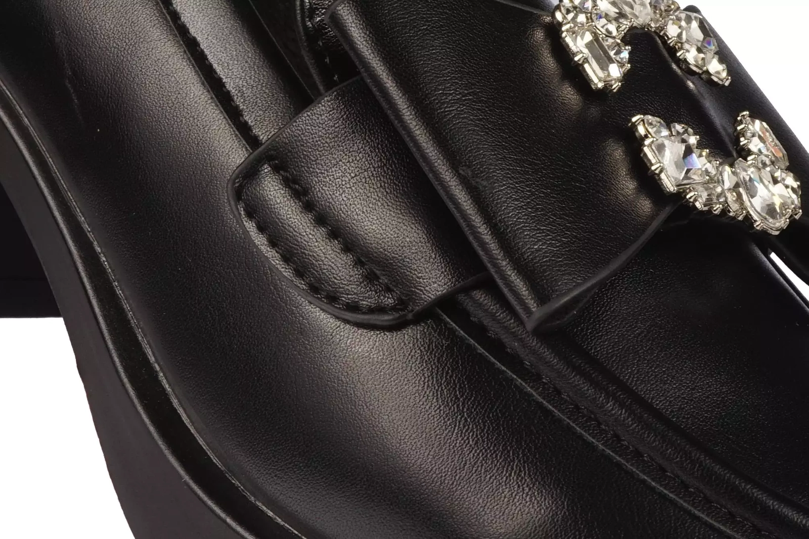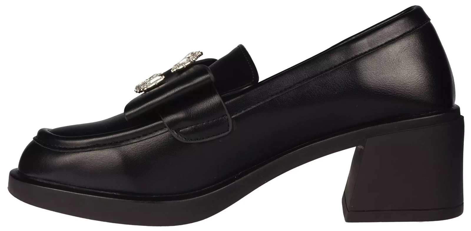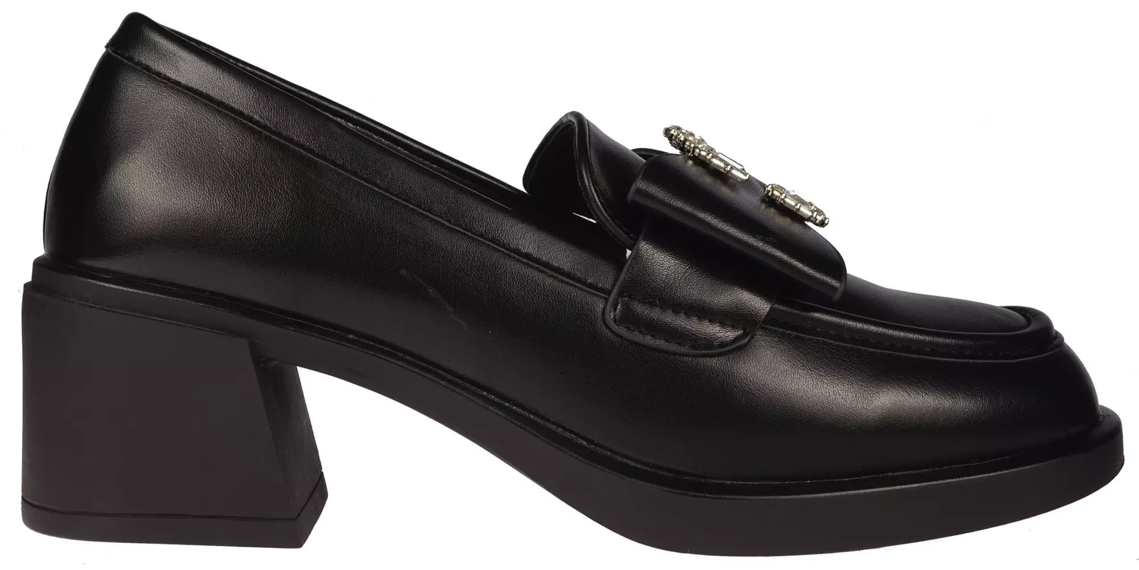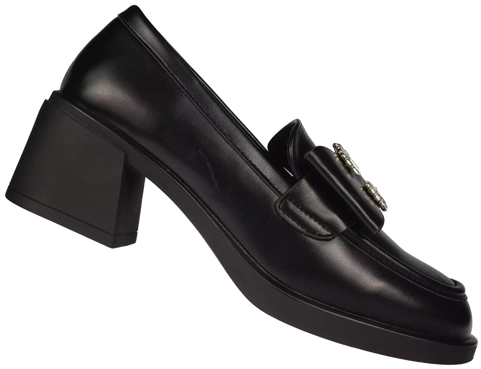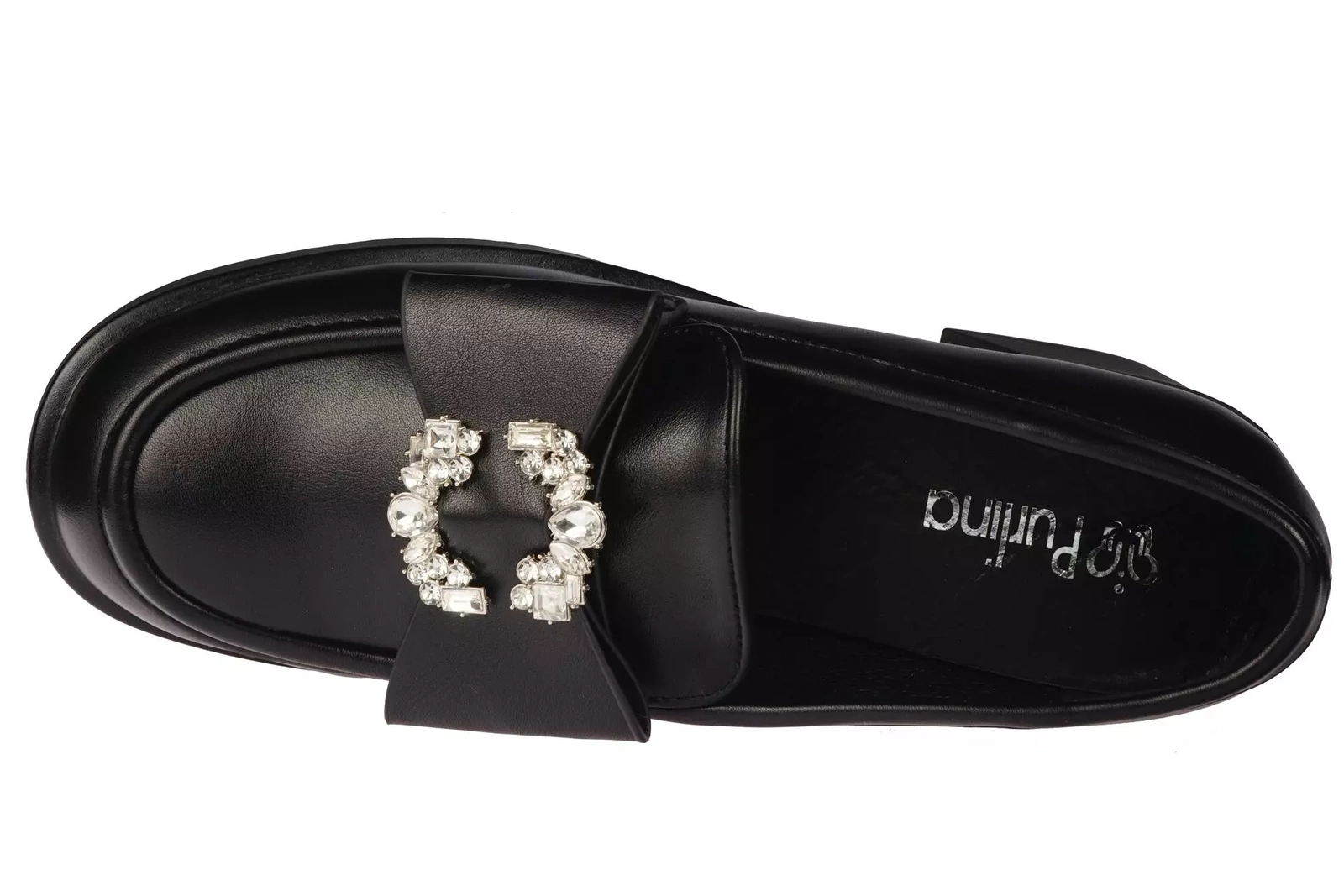 Półbuty damskie firmy Purlina w klasycznej ciemnej kolorystyce z ozdobną kokardą i dodającą elegancji, świecącą klamerką z ozdobnych cyrkonii. Wykonano czółenka z ekoskóry najwyższej jakości, przez co są komfortowe w użytkowaniu. Zewnętrzna warstwa jest licowana co jeszcze bardziej podkreśla gustowny wygląd produktu, natomiast wykończenie wewnątrz i miękka wkładka dbają o odpowiednią wentylację i wygodę na najwyższym poziomie. Czarne półbuty na klockowym obcasie dodają kilku centymetrów, ale nie utrudniają poruszania. Dodatkowym plusem obuwia dla kobiet jest antypoślizgowa podeszwa, która zapobiega ślizganiu się i jeszcze bardziej dba o stabilność. Okrągły nosek w połączeniu z ozdobami na przodzie i profilowaną podeszwą tworzą spójną całość, która jest połączeniem klasyki i elegancji. Czółenka damskie są wygodne i lekkie co tworzy ten model idealnym na co dzień jak również będzie pasować do bardziej eleganckich stylizacji.