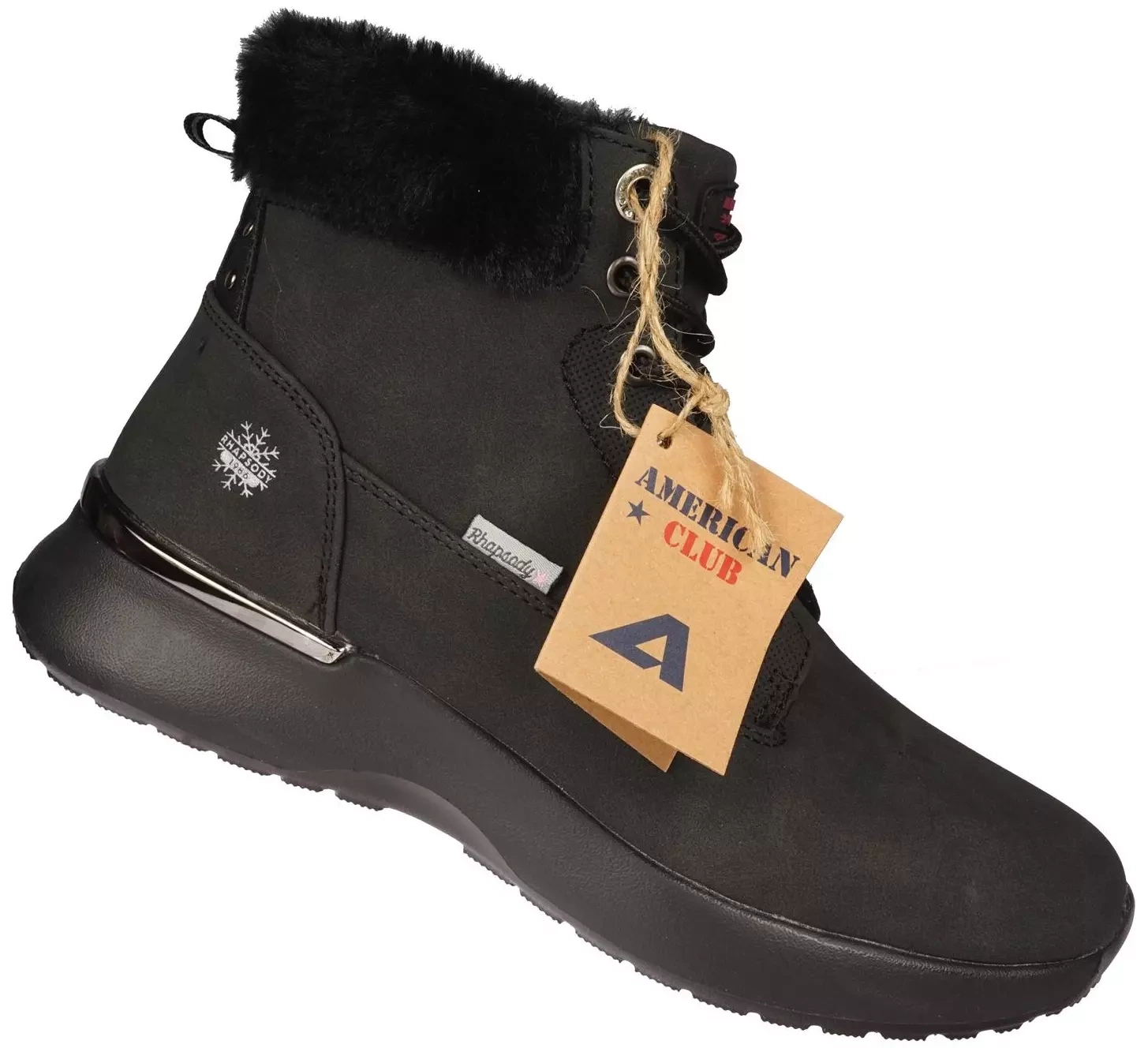 - Buty damskie na zimę w kolorze czarnym z American Club. Obuwie za kostkę z polarem i skórą ekologiczną to idealne połączenie, które chroni przed zimnem i wiatrem. Trapery posiadają piankową podeszwę wykończona gumą co zapewnia najwyższy komfort użytkowani