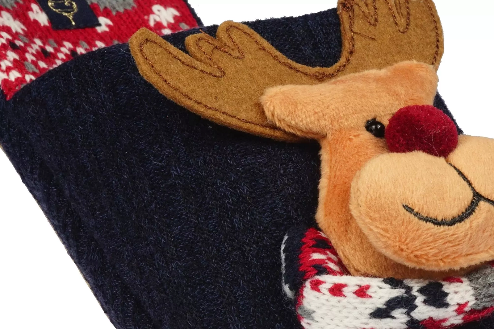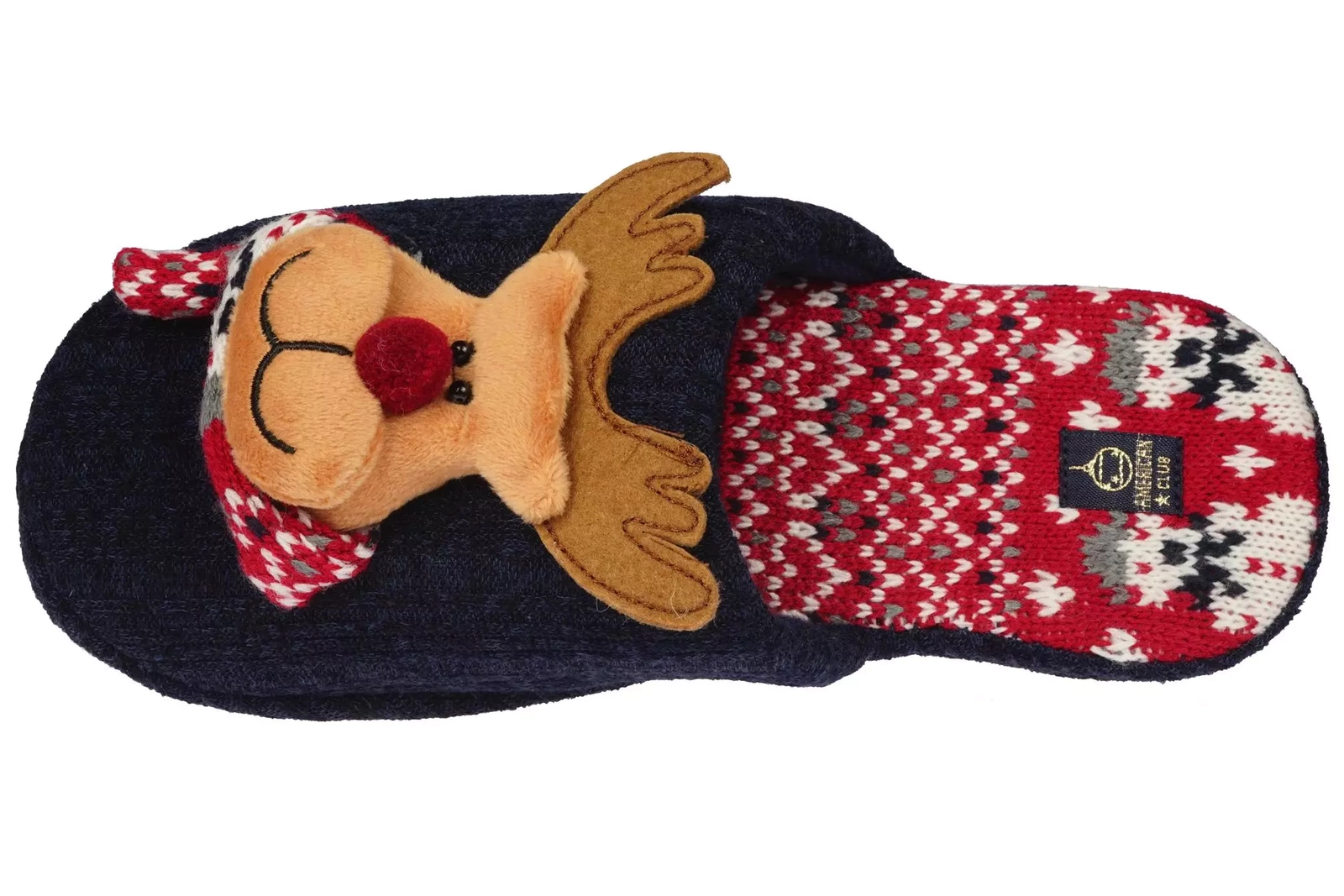 - Granatowe damskie pantofle tekstylne od American Club z wypukłym reniferem i świątecznym printem to nie tylko stylowe obuwie, ale także źródło ciepła i komfortu. Te świąteczne kapcie mają miękką gumowa podeszwę, która zapewnia komfort kroków.