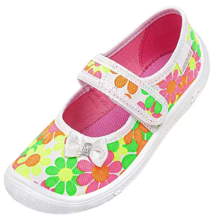 Tenisówki dziecięce Viggami wielokolorowe, z kokardą na przodzie oraz grafiką kwiatów na całej powierzchni. Produkt jest stworzony w Polsce przez firmę Viggami. Kapcie posiadają elastyczną antypoślizgową podeszwę która jest wentylowana od spodu, zapewnia ona wygodę, i bezpieczeństwo naszych pociech. Kapcie są zapinanie na rzep co znacznie ułatwia samodzielne zakładanie obuwia przez dziecko oraz zapewnia idealne dopasowanie się do stopy. Pantofle Viggami sprawdzą się do przedszkola czy szkoły jak i harcowania po domu. Certyfikat zdrowej stopy który zapewnia , że obuwie wykonane jest prawidłowo pod względem konstrukcyjnym, technologicznym i materiałowym oraz prezentuje się estetycznie. Dzięki niemu rodzice mają pewność, że stópki ich dzieci są bezpieczne i właściwie się rozwijają.