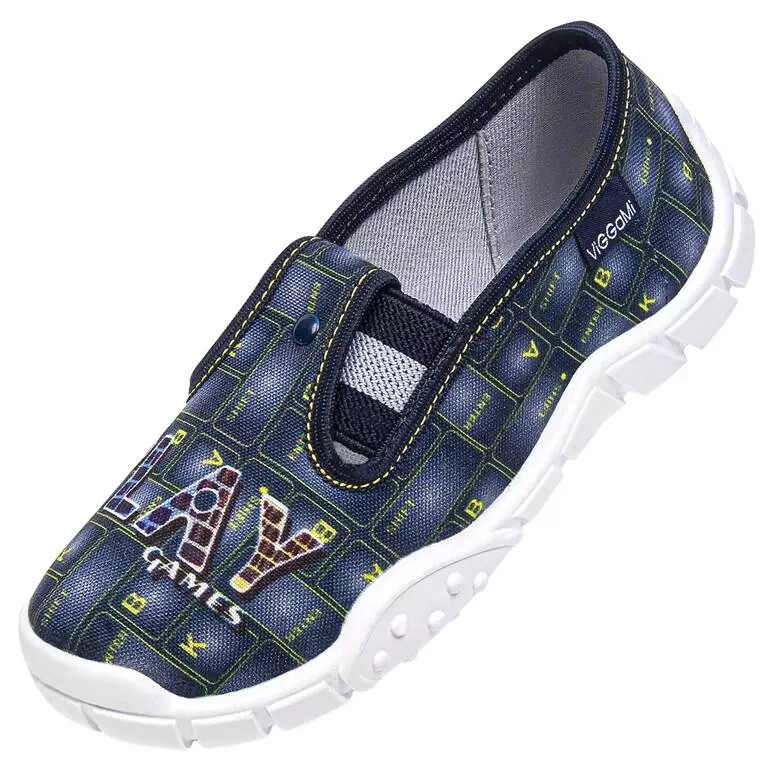 - Tenisówki dziecięce Viggami w granatowym kolorze z wzorem klawiatury oraz napisem play. Kapcie są wsuwane co znacznie ułatwia samodzielne zakładanie obuwia przez dziecko. Posiadają certyfikat zdrowej stopy.