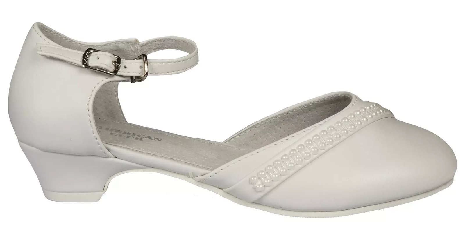 Eleganckie półbuty dziewczęce firmy American Club w klasycznym białym kolorze ozdobami na przodzie. Wykonane zostały bardzo solidnie i starannie ze skóry ekologicznej. Posiadają obcas, który dodaje kilku centymetrów, a w połączeniu ze skórzaną wkładką oraz wnętrzem zapewniają wysoki komfort podczas użytkowania. Zapinane są na metalową klamerkę na pasku, dzięki temu można je idealnie dopasować do stopy. Idealnie sprawdzą się na specjalne okazje.