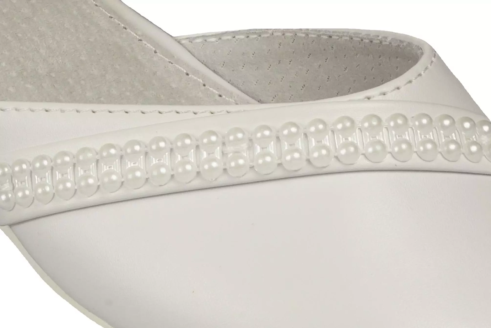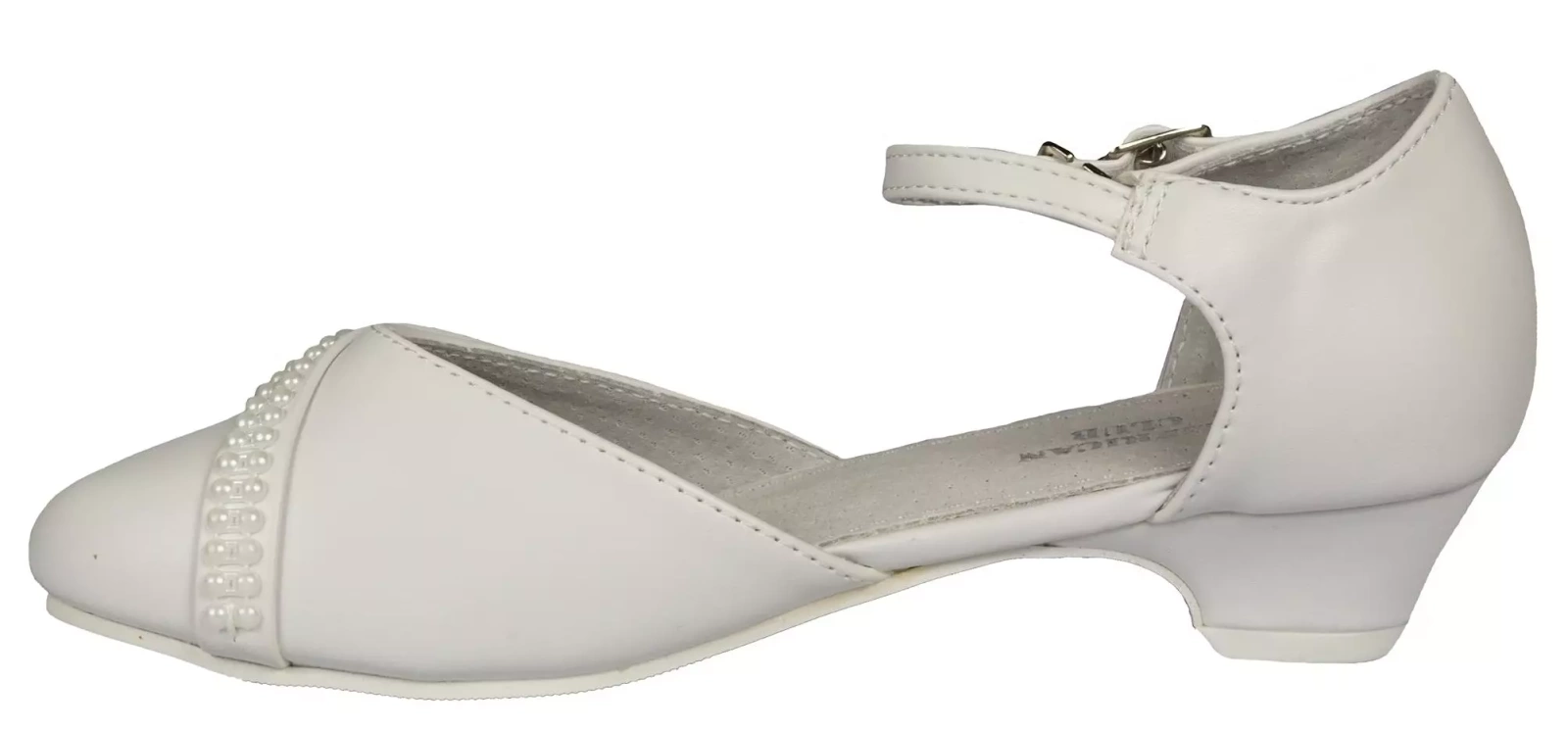 - Eleganckie półbuty dziewczęce firmy American Club w klasycznym białym kolorze ozdobami na przodzie. Zapinane są na metalową klamerkę na pasku. Posiadają skórzaną wkładkę oraz wnętrze. Idealnie sprawdzą się na specjalne okazje.