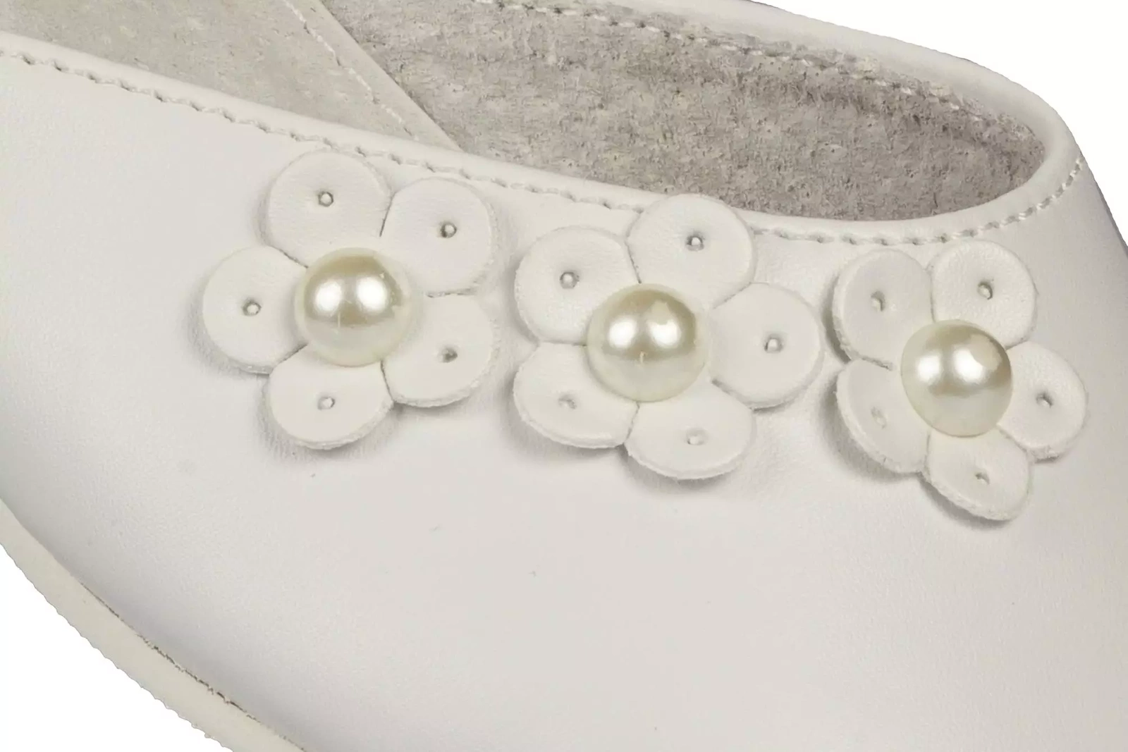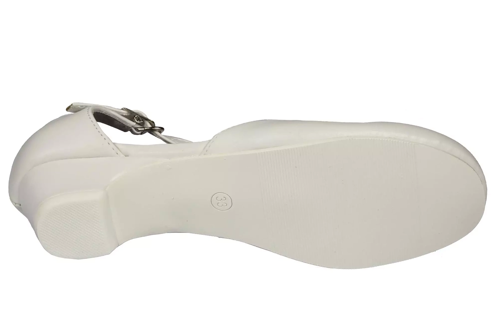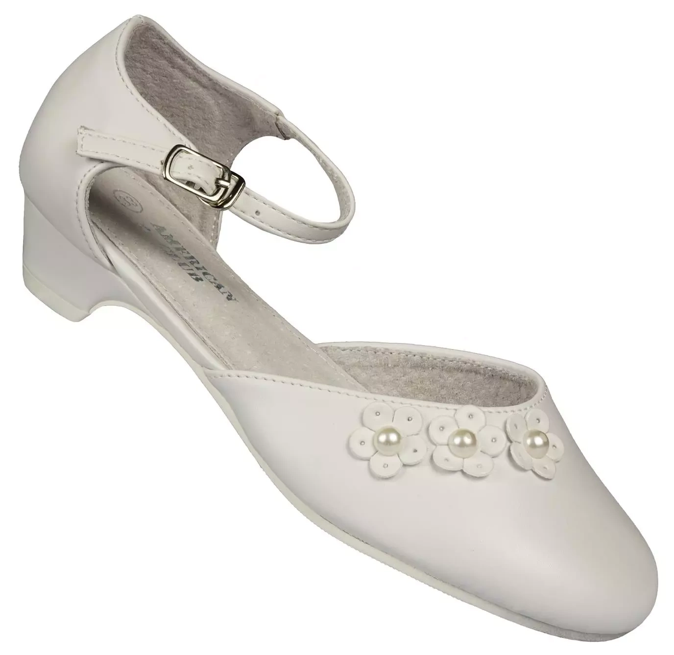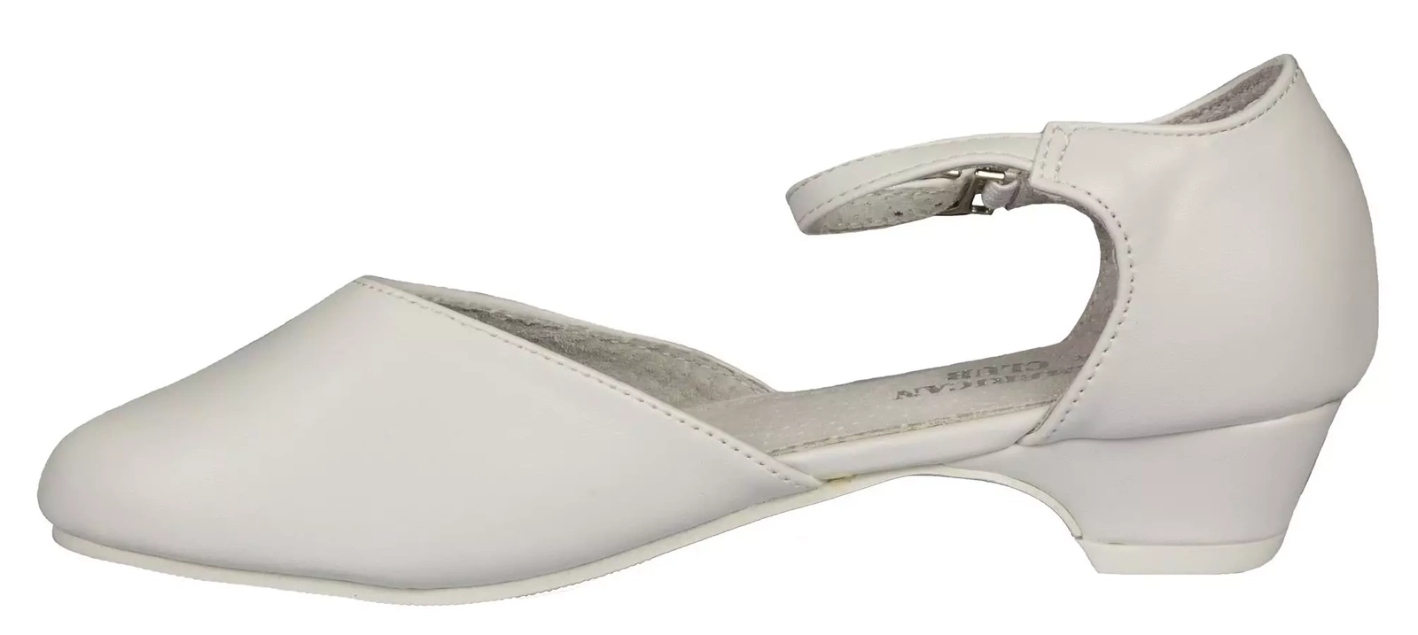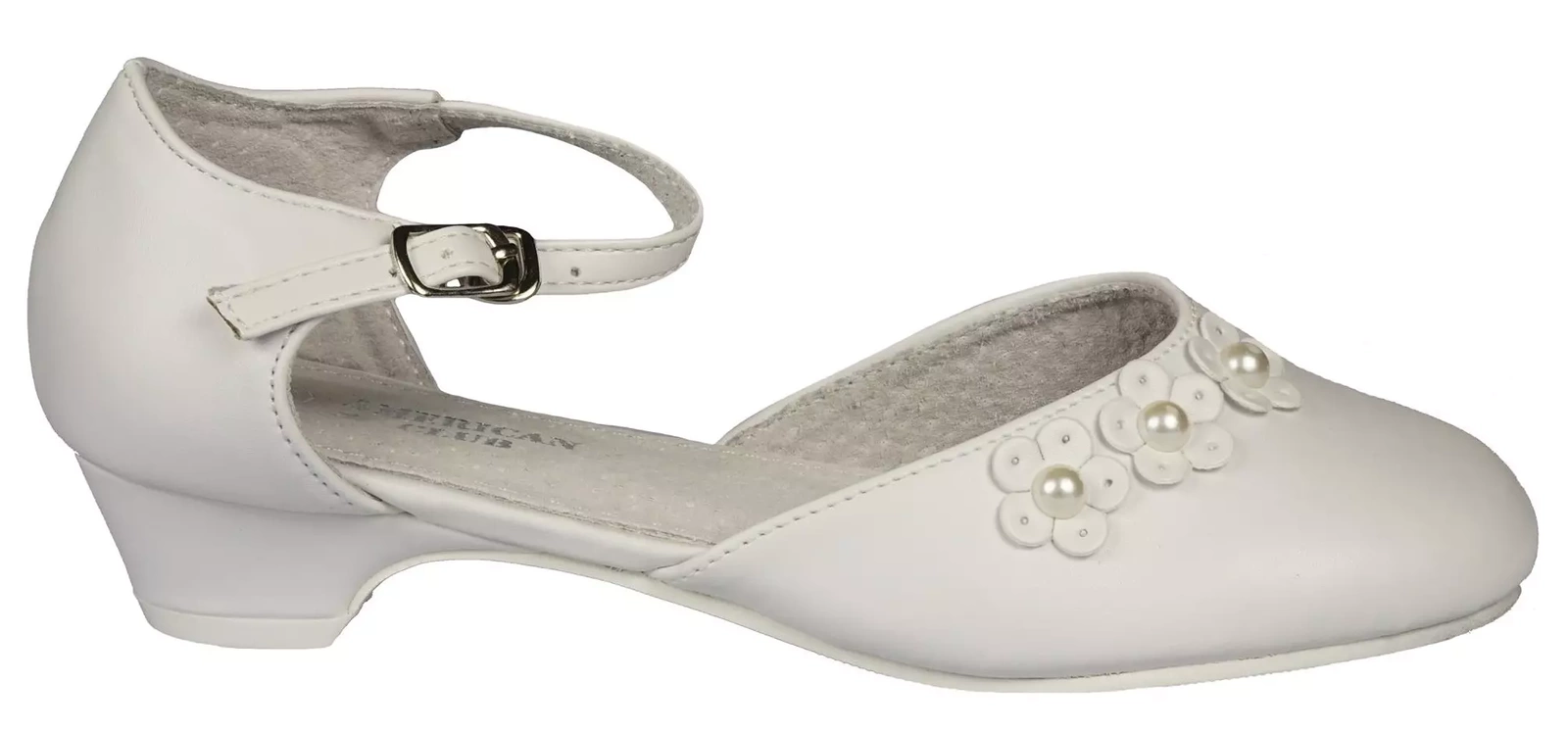 Eleganckie półbuty dziewczęce firmy American Club w klasycznym białym kolorze ozdobami na przodzie. Wykonane zostały bardzo solidnie i starannie ze skóry ekologicznej. Posiadają obcas, który dodaje kilku centymetrów, a w połączeniu ze skórzaną wkładką oraz wnętrzem zapewniają wysoki komfort podczas użytkowania. Zapinane są na metalową klamerkę na pasku, dzięki temu można je idealnie dopasować do stopy. Idealnie sprawdzą się na specjalne okazje.