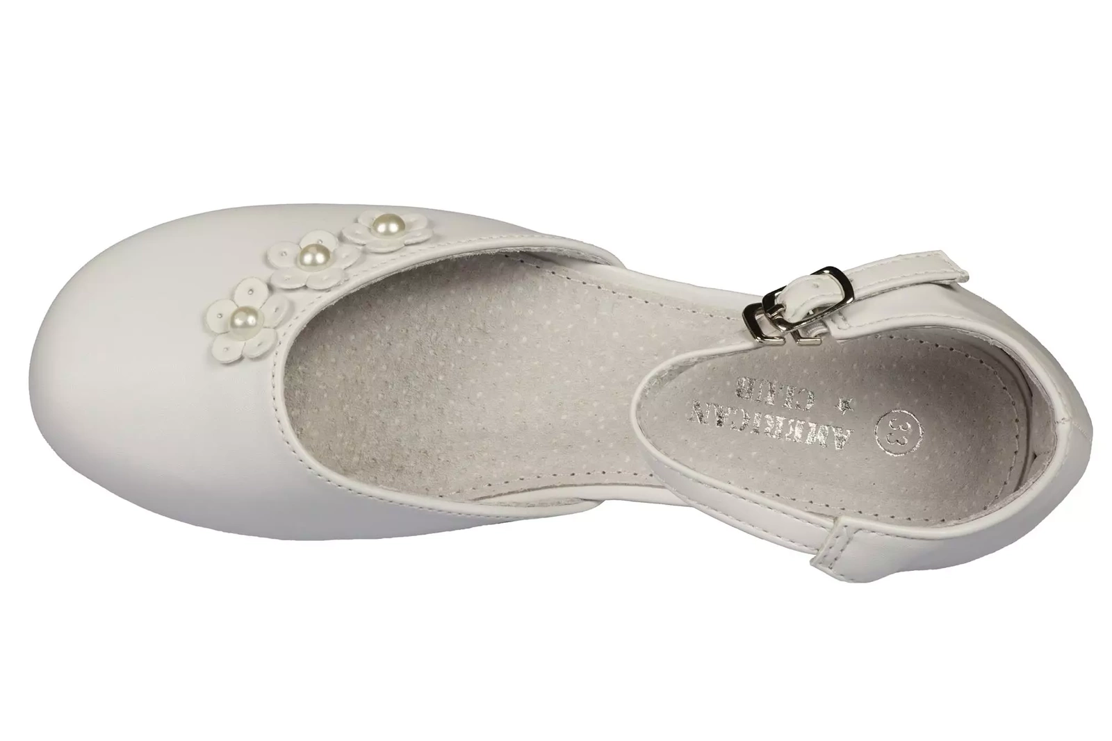- Eleganckie półbuty dziewczęce firmy American Club w klasycznym białym kolorze ozdobami na przodzie. Zapinane są na metalową klamerkę na pasku. Posiadają skórzaną wkładkę oraz wnętrze. Idealnie sprawdzą się na specjalne okazje.