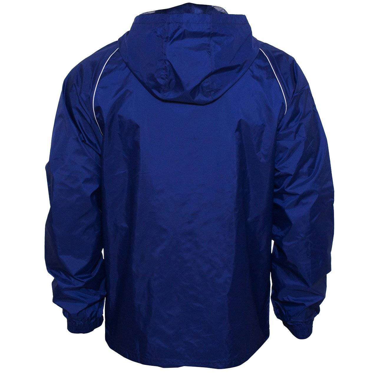 - Męska przeciwdeszczowa kurtka marki Adidas w kolorze granatowym. Model posiada długie rękawy ze ściągaczem oraz kaptur, również ze ściągaczem. Kurtkę zdobią białe, delikatne paski oraz biały logotyp.