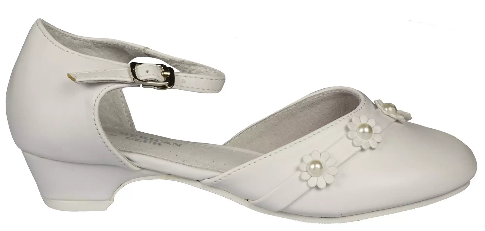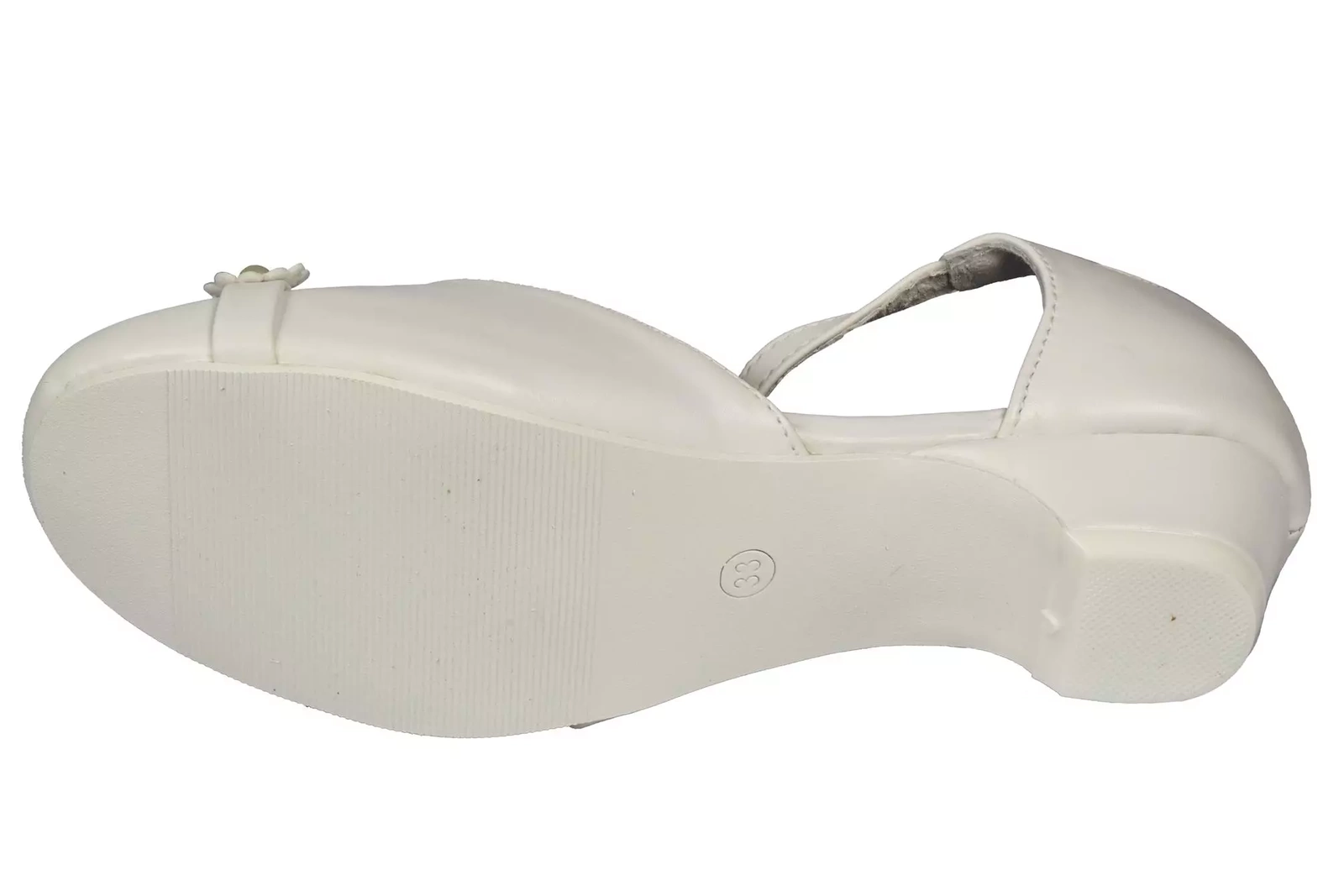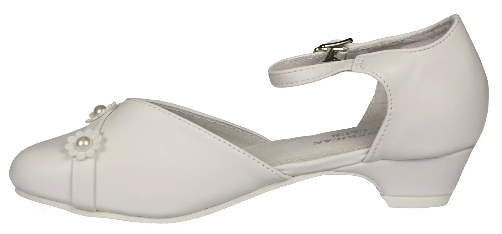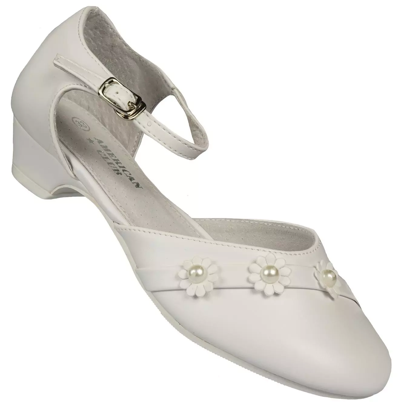 Eleganckie półbuty dziewczęce firmy American Club w klasycznym białym kolorze ozdobami na przodzie. Wykonane zostały bardzo solidnie i starannie ze skóry ekologicznej. Posiadają obcas, który dodaje kilku centymetrów, a w połączeniu ze skórzaną wkładką oraz wnętrzem zapewniają wysoki komfort podczas użytkowania. Zapinane są na metalową klamerkę na pasku, dzięki temu można je idealnie dopasować do stopy. Idealnie sprawdzą się na specjalne okazje.