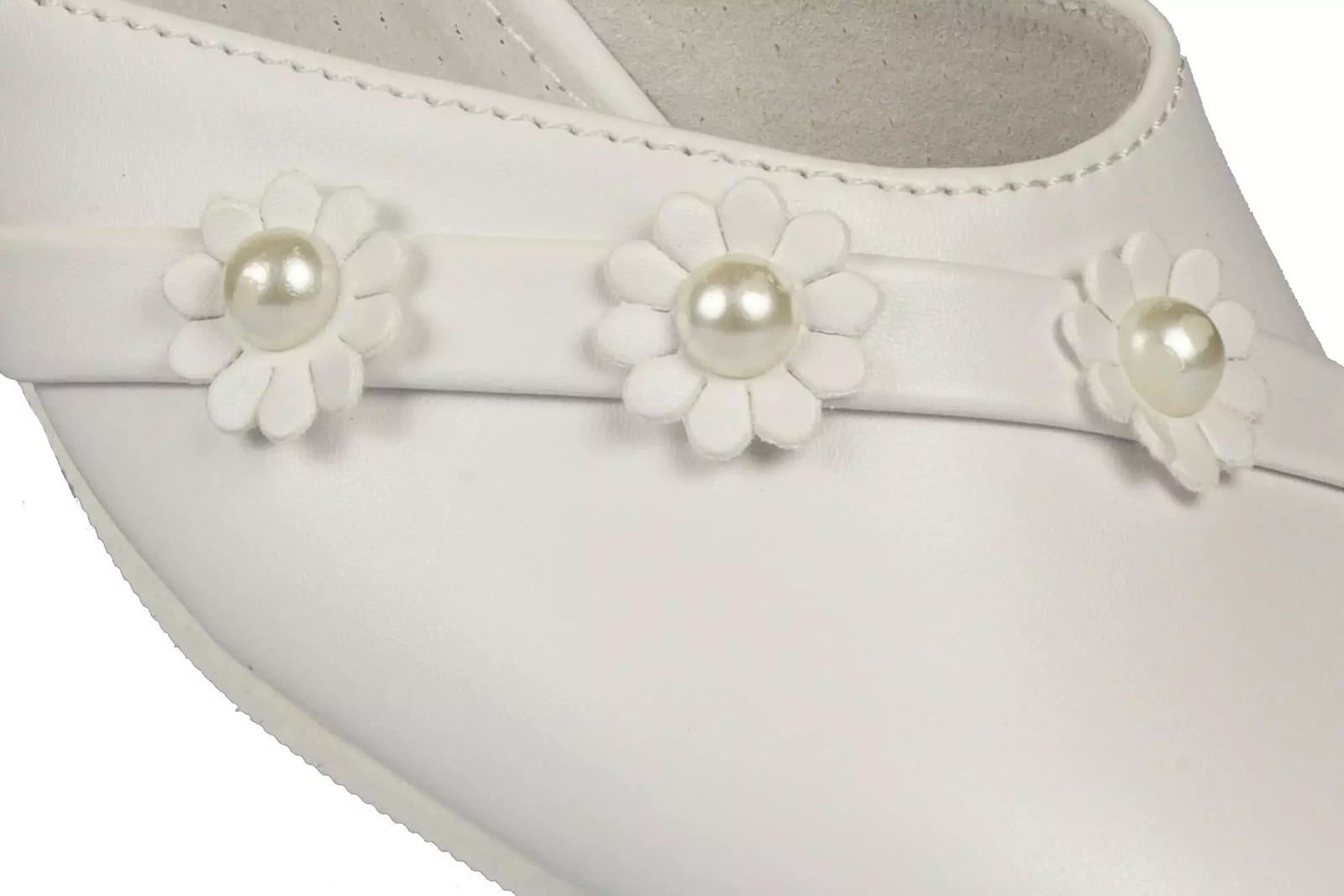 - Eleganckie półbuty dziewczęce firmy American Club w klasycznym białym kolorze ozdobami na przodzie. Zapinane są na metalową klamerkę na pasku. Posiadają skórzaną wkładkę oraz wnętrze. Idealnie sprawdzą się na specjalne okazje.