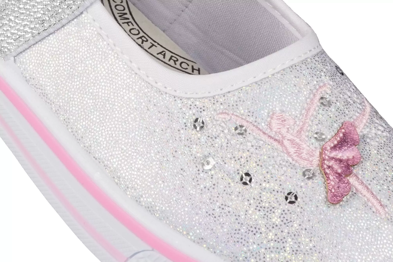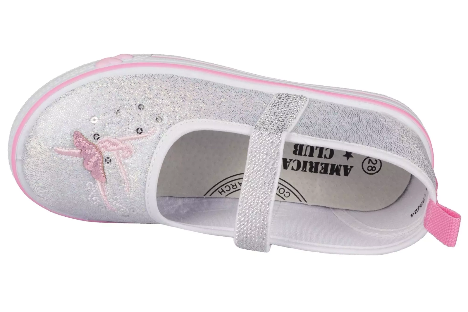- Tenisówki dziecięce American Club w kolorze szarym to doskonały wybór dla małych fashionistek. Wsuwane buty na gumkę posiadają gumową podeszwę, która gwarantuje stabilność na każdej powierzchni. Brokatowe tenisówki posiadają haftowanego motylka.