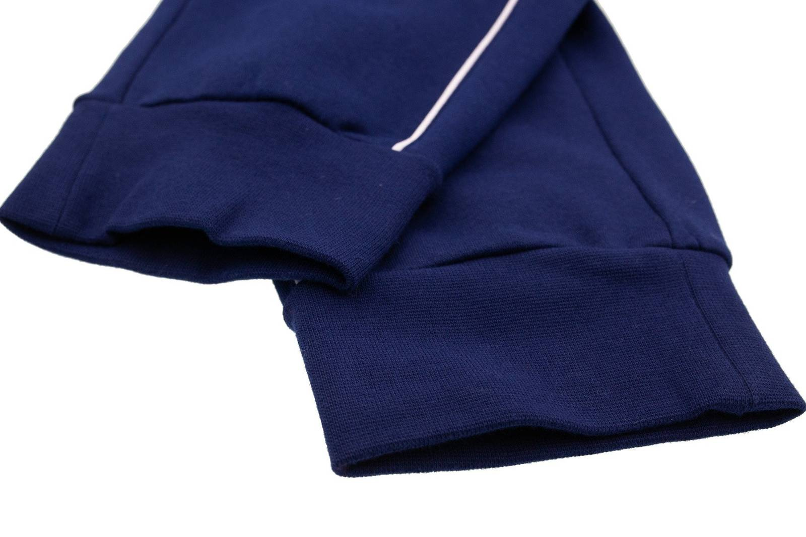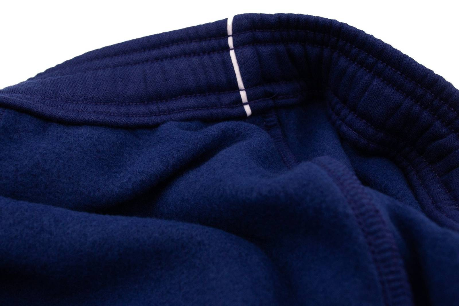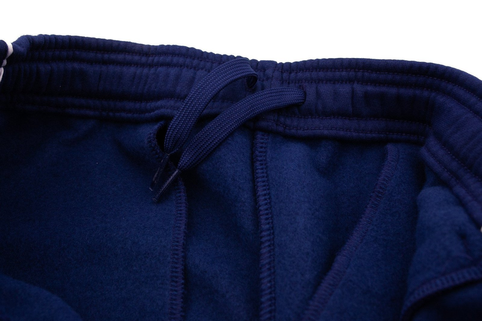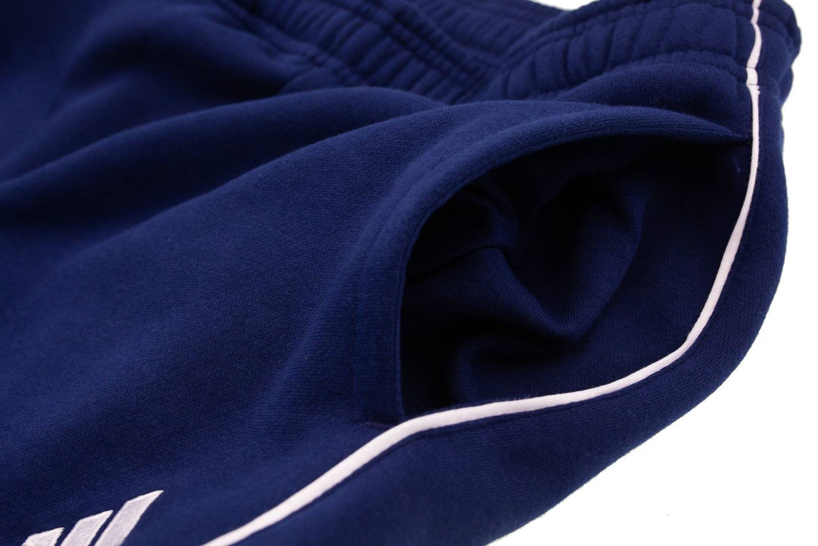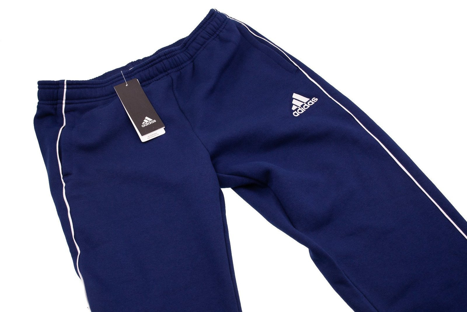- Spodnie dresowe juniorskie marki Adidas, w kolorze granatowym. Spodnie posiadają ozdobny pasek po bokach nogawek oraz logotyp marki. Wykonane w 70% z bawełny i 30% z poliestru, dzięki czemu doskonale nadają się na wszelkiego rodzaju treningi.
