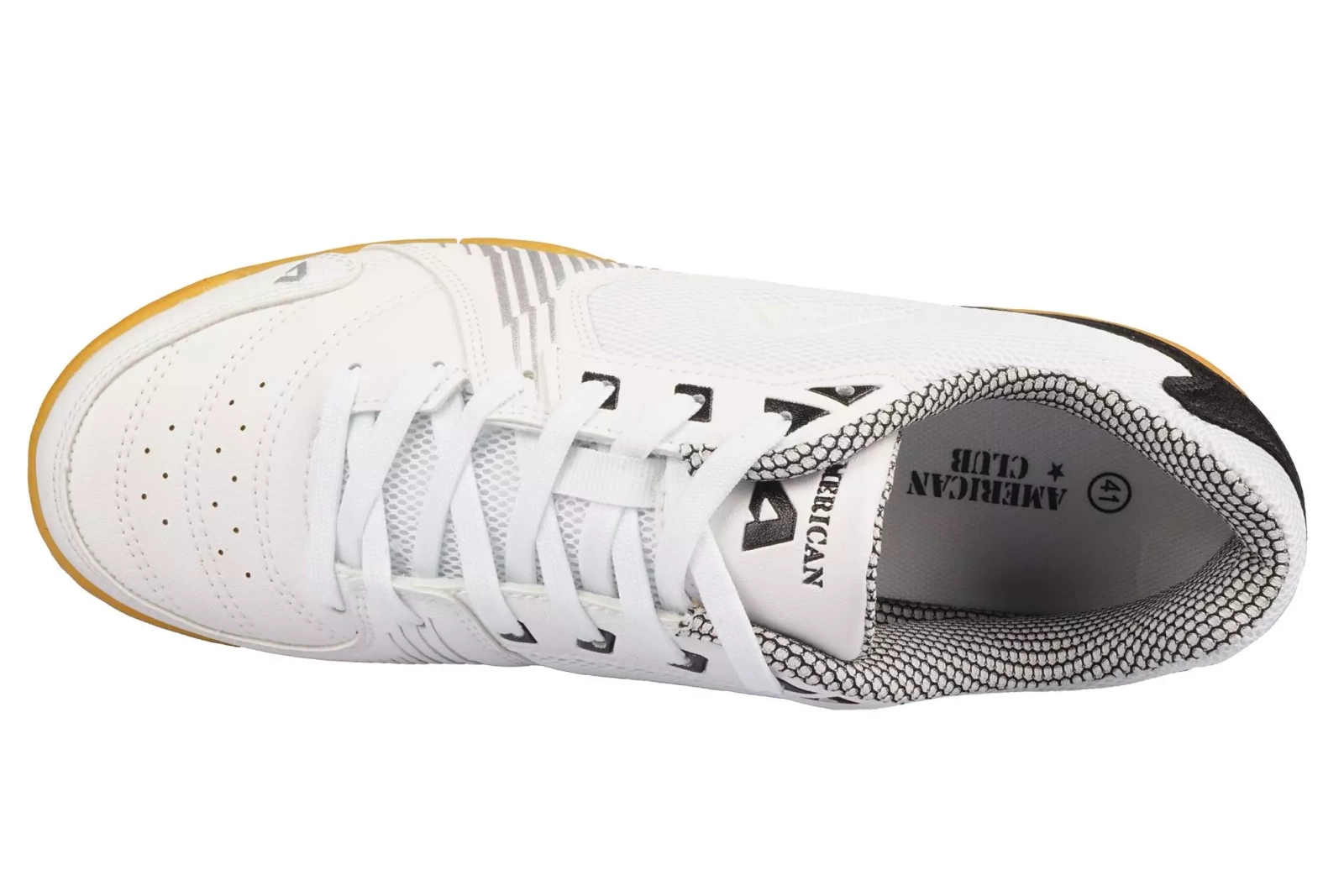 - Białe halówki American Club to doskonały wybór dla aktywnych mężczyzn, którzy stawiają na komfort i funkcjonalność. Wiązane obuwie halowe ze skóry ekologicznej i miękkiego materiału tekstylnego zapewnia wygodę i komfort podczas użytkowania.