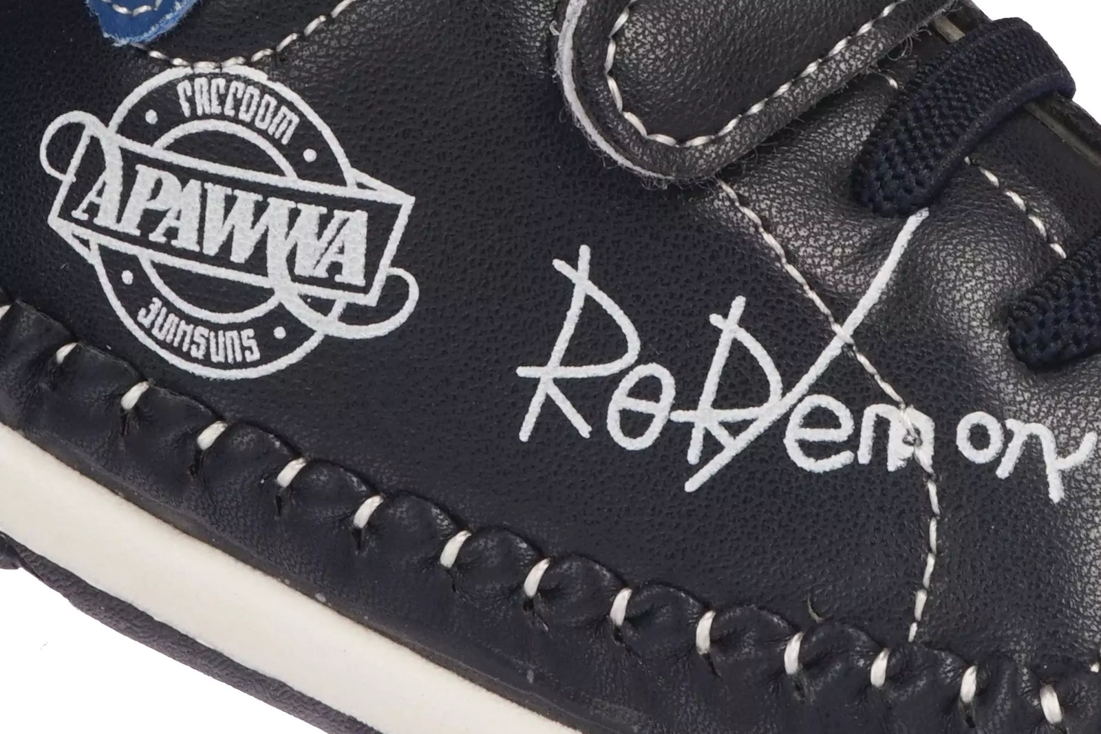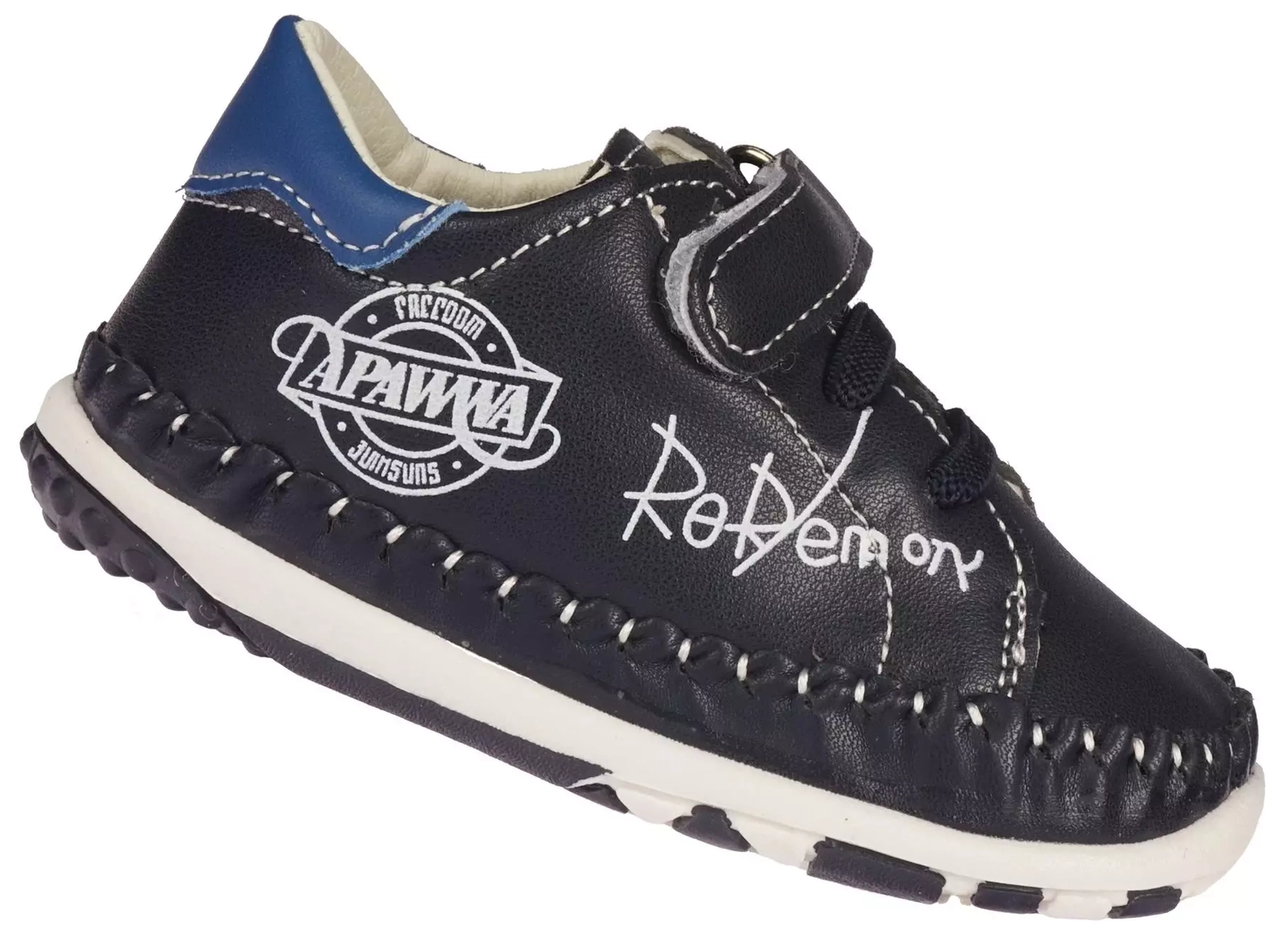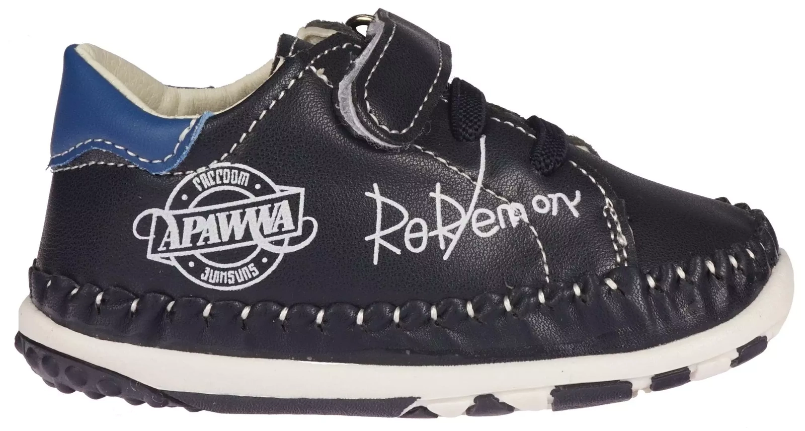 Dziecięce obuwie Apawwa w kolorze granatowym z minimalną grafiką i ciekawymi przeszyciami. Półbuty dla dziecka ze skóry ekologicznej, która jest trwała i odporna na warunki atmosferyczne, co sprawia, że buty są odporne na uszkodzenia oraz łatwe w utrzymaniu czystości. Wkładka ze skóry naturalnej w butach dziecięcych Apawwa zapewnia wyjątkowy komfort noszenia oraz doskonałą wentylację dla stóp dziecka. Ponadto, skóra naturalna jest miękka i dopasowuje się do kształtu stopy, co przyczynia się do zapewnienia optymalnego wsparcia i wygody podczas noszenia użytkowania obuwia. Buciki nie mają usztywnianej pięty, jest ona natomiast lekko usztywniana, dzięki temu dzieci mogą swobodnie poruszać się, jednocześnie mając odpowiednie wsparcie dla swoich stóp. Obuwie zapinane na rzepę ułatwia zakładanie i idealne dopasowanie, a gumowa podeszwa w butach dziecięcych może zapewnić doskonałą przyczepność do różnych rodzajów podłoża, co przekłada się na większe bezpieczeństwo podczas zabawy na zewnątrz. Półbuty Apawwa są stworzone w ciekawym, unikatowym ale nie przesadnym designie. Wszystko to sprawia, że produkt ten jest idealnym wyborem dla dziecka jako obuwie do codziennego użytku.
