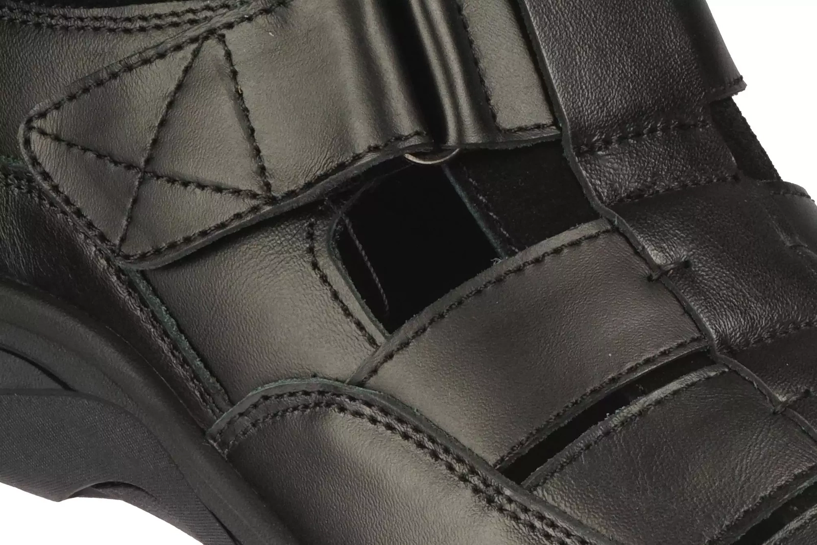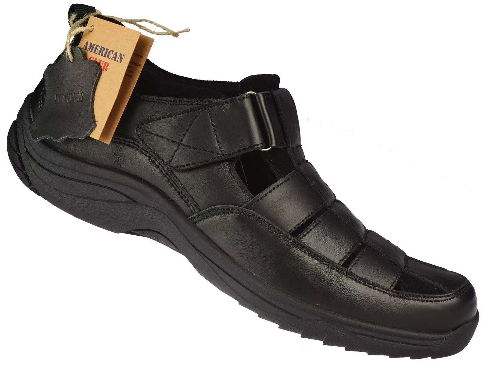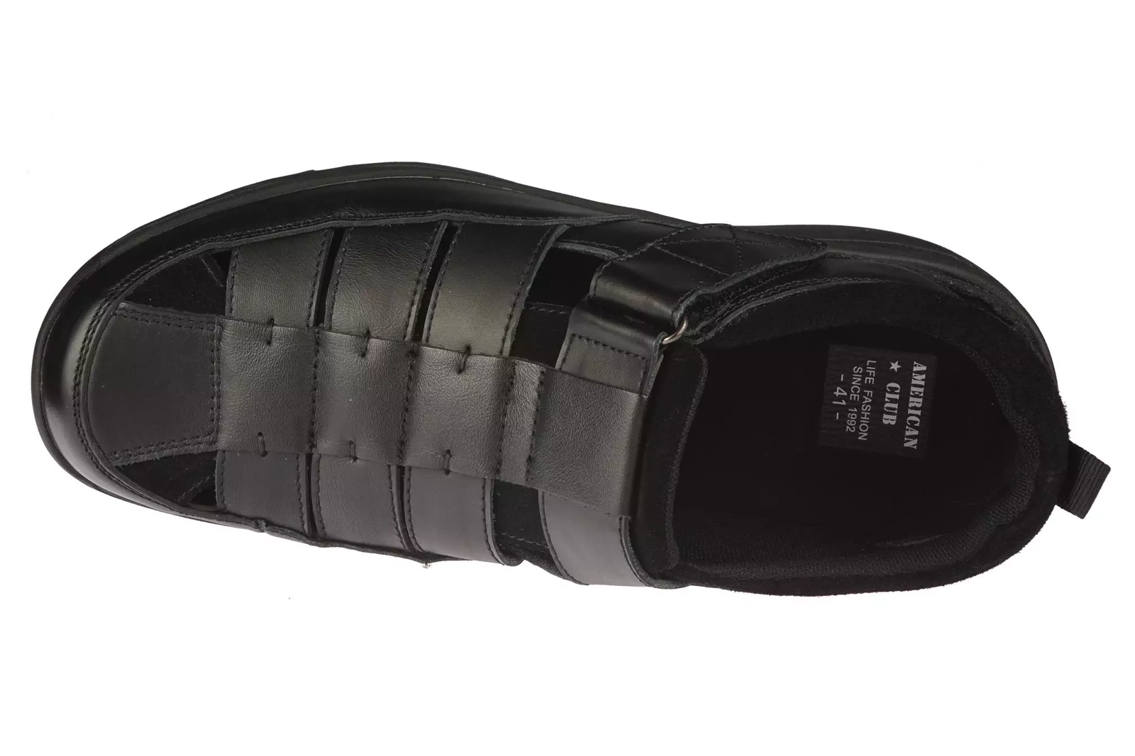 - Sandały męskie firmy American Club w kolorze czarnym wykonane ze skóry naturalnej. Miękka, tekstylna wkładka, odpowiada za komfort i prawidłowe ułożenie stopy podczas chodzenia oraz zapobiega nadmiernemu poceniu się. Buty są zapinane na rzep.