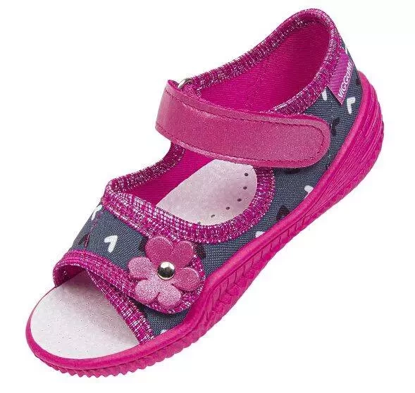 - Sandałki dziecięce Viggami à la sandałki w granatowo-różowym kolorze. Kapcie są zapinanie na rzep co znacznie ułatwia samodzielne zakładanie obuwia przez dziecko. Posiadają certyfikat zdrowej stopy oraz skórzaną wkładkę.