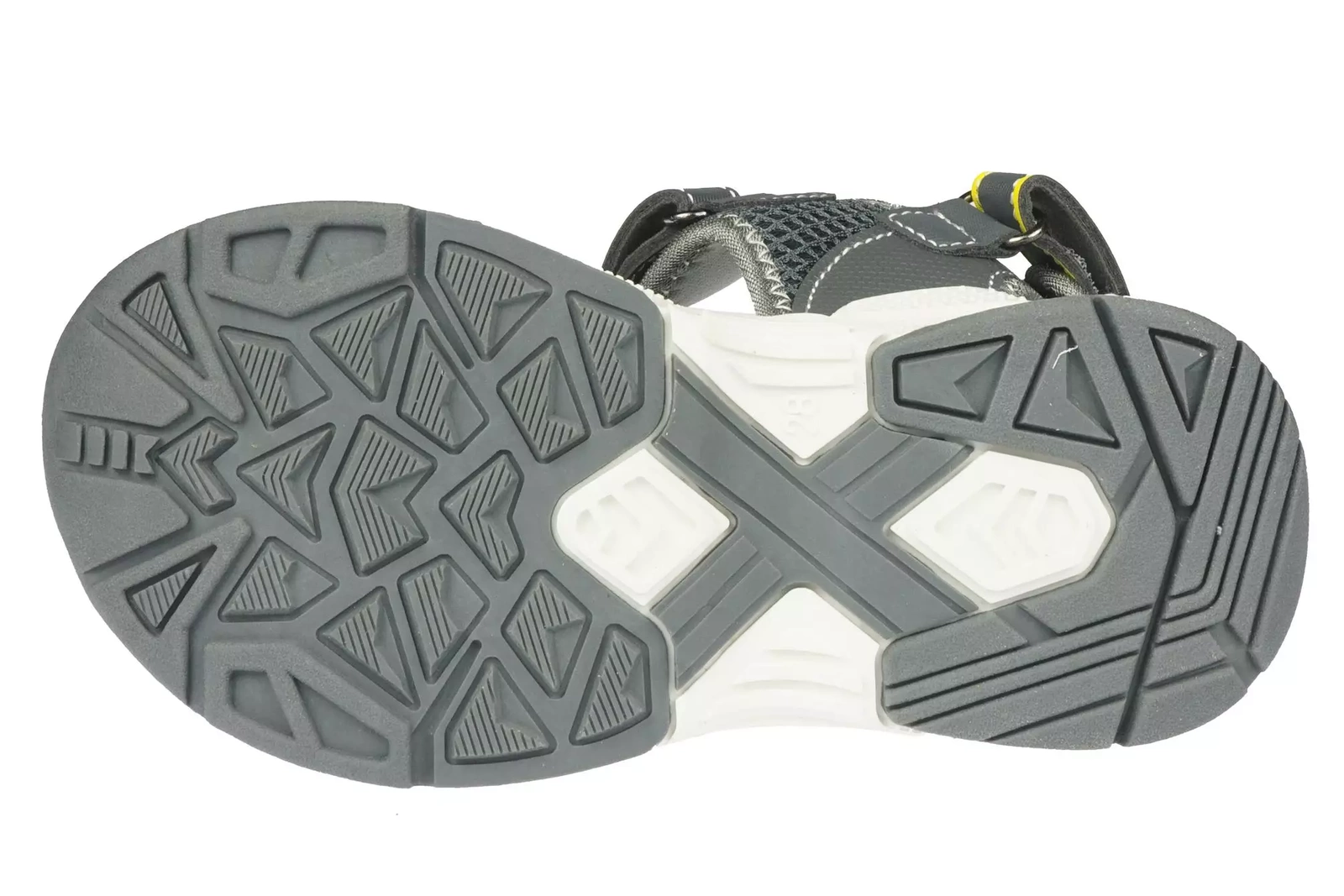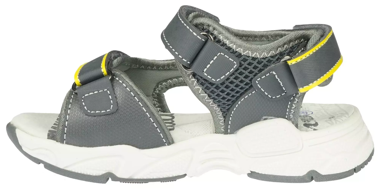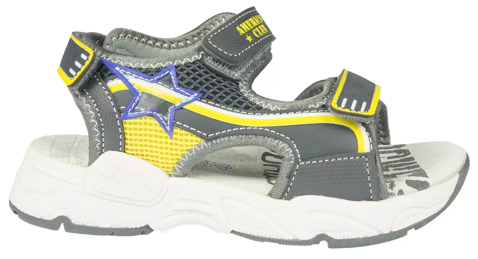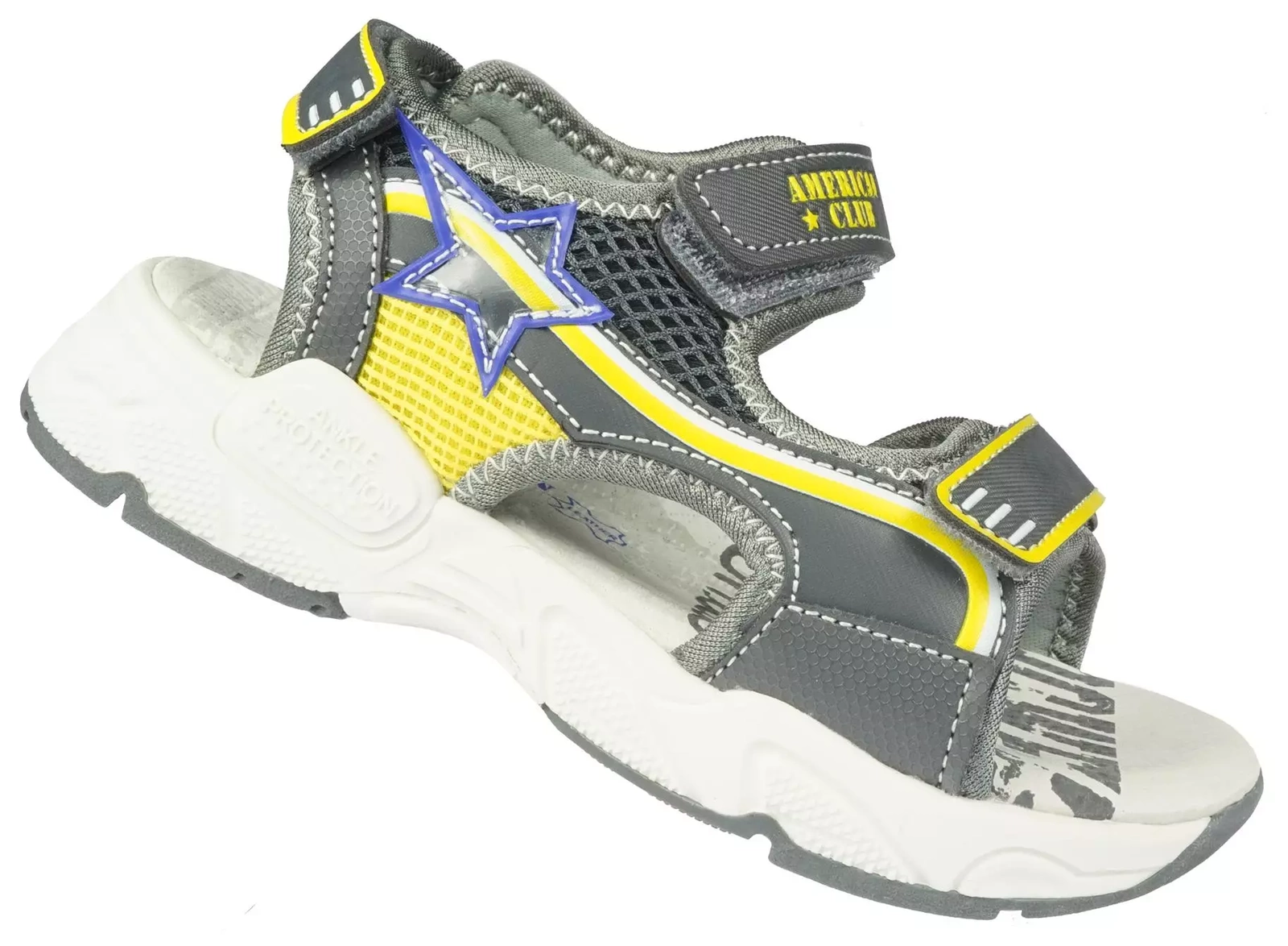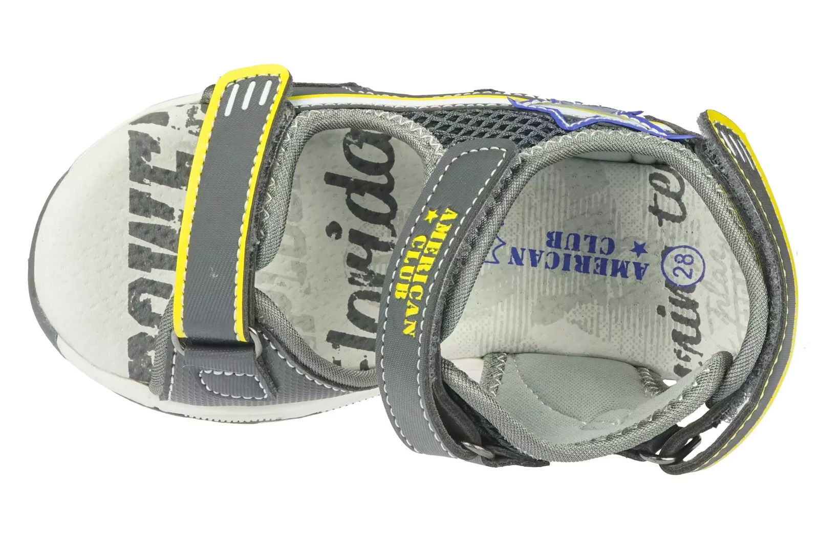 Dziecięce sandały firmy American Club w kolorze szarym z żółtymi elementami oraz gwiazdą na boku. Wykonane zostały w bardzo ciekawym, ładnym stylu i unikatowej konstrukcji. Wykorzystane do produkcji wysokiej jakości skóra ekologiczna, skóra naturalna oraz materiały tekstylne gwarantują komfort użytkowania i zapobiegają przed powstawaniem podrażnień i odcisków. Skórzana wkładka dba o prawidłowy rozwój stopy dziecka, za idealną wentylację odpowiadają otwarte palce oraz pięta. Kolejną zaletą sandałów dziecięcych są 3 rzepy umieszczone na śródstopiu i pięcie, które pozwalają na idealne dopasowanie oraz na łatwe samodzielne zapinanie przez dziecko a lekka piankowa podeszwa zapobiega ślizganiu. Każda z cech tego sandała dziecięcego składa się na to, że obuwie jest bezpieczne, wygodne i praktyczne. Model ten to doskonały wybór na lato do zabawy i użytku codziennego dla dziecka.