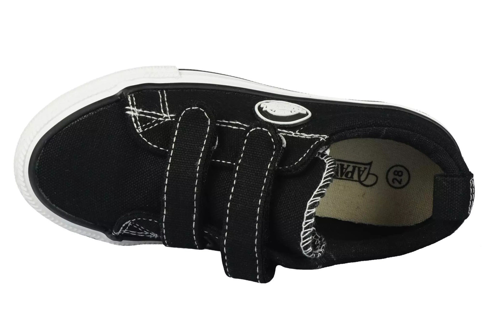 Tenisówki dziecięce w kolorze czarnym, których producentem jest firma Apawwa. Zostały wykonane z materiałów tekstylnych o bardzo wysokiej jakości, model jest solidny, schludnie wykonany i dobrze leży na nodze. Buty posiadają grubą, gumową podeszwę co zapewnia im trwałość i bardzo dobrą przyczepność do podłoża. Ich klasyczna budowa urozmaicona została ciekawymi przeszyciami, które przyciągają uwagę. Zapięcie na rzep ułatwia i znacznie przyspiesza zakładanie obuwia przez dzieci. Wnętrze jest bardzo delikatne i przyjazne dla skóry dzięki czemu noga się nie męczy nawet po korzystaniu z nich przez dłuższy czas. Tenisówki te są lekkie i wygodne. Obuwie nada się idealnie do szkoły czy używania na co dzień.