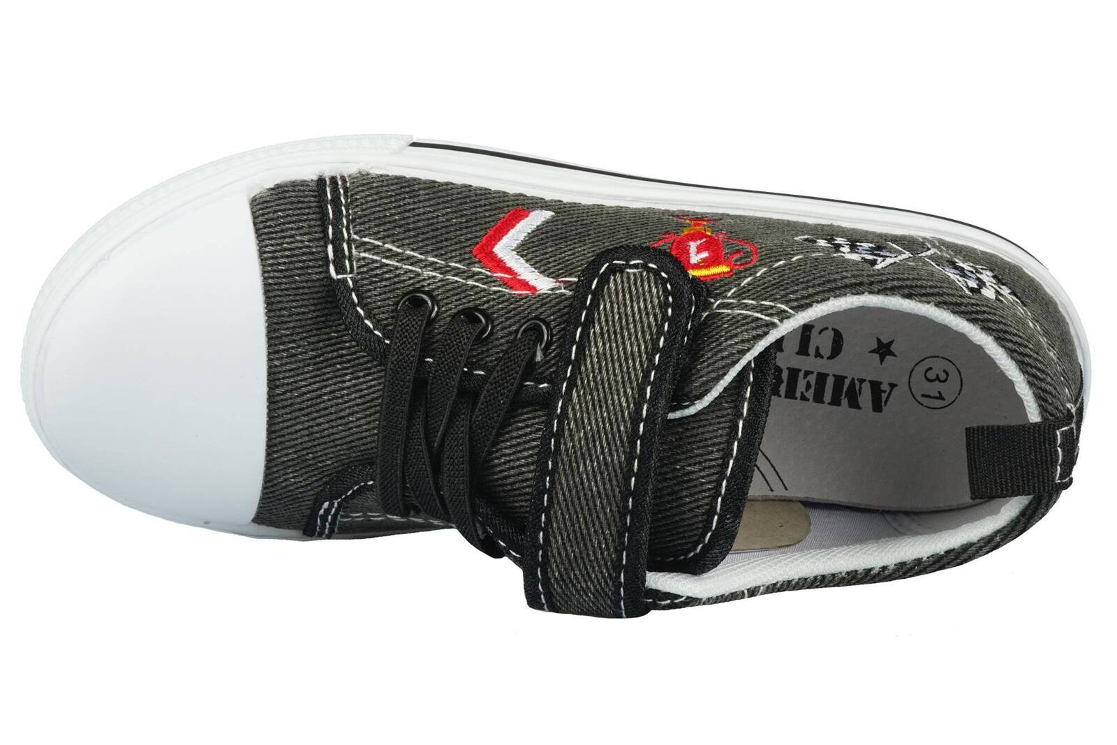 - Tenisówki firmy American w kolorze czarnym. Wykonane zostały bardzo solidnie i starannie z materiałów tekstylnych o wysokiej jakości. Podeszwa jest płaska i gumowa dzięki czemu zapewnia dobrą przyczepność do podłoża, obuwie jest zapinane na rzep.
