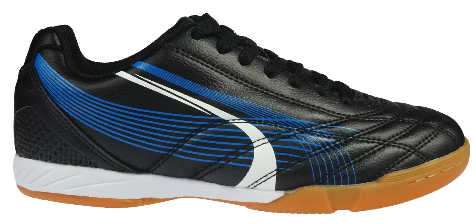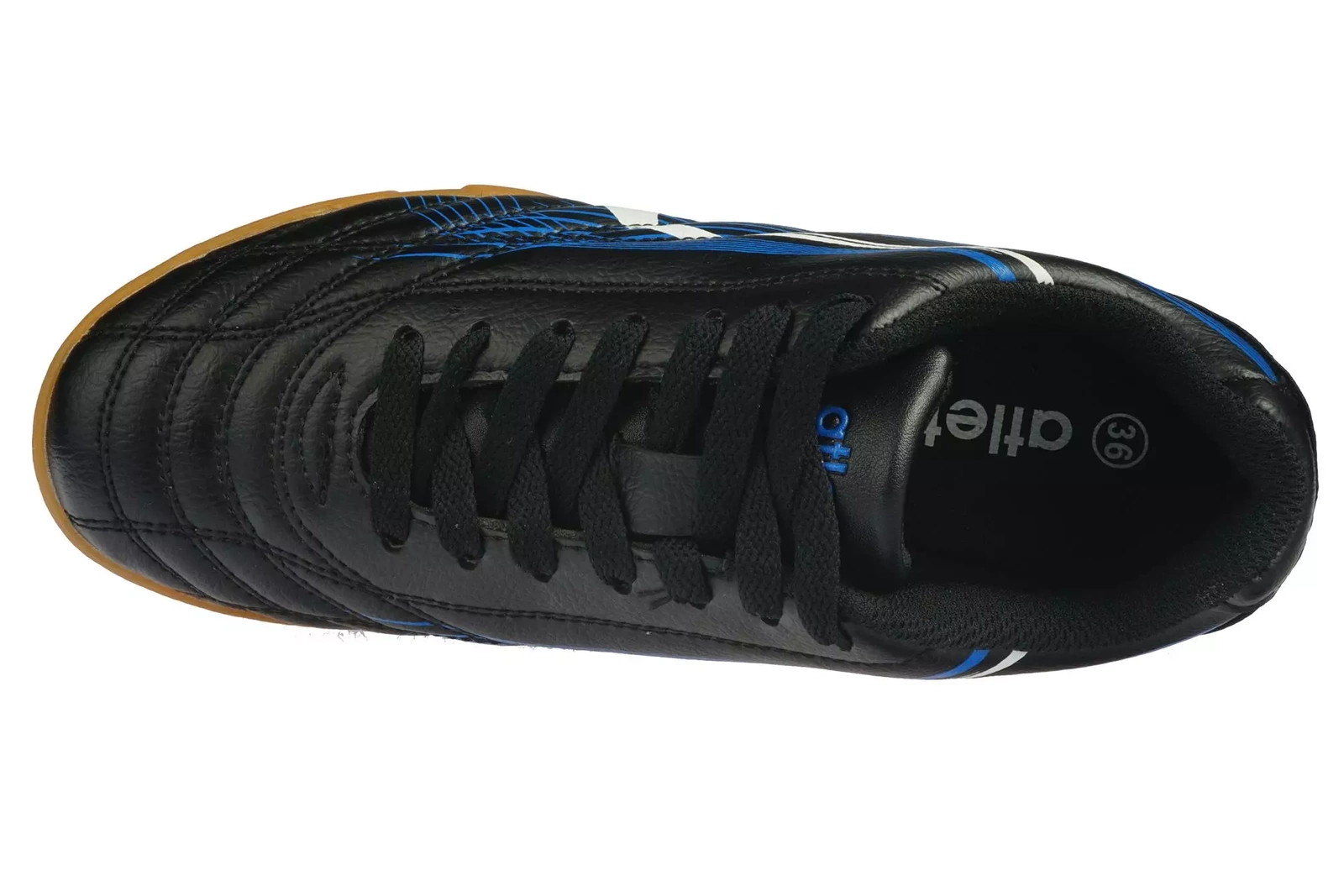 Męskie halówki Atletico w kolorze czarnym, z niebieskimi elementami. Wykonane z trwałej skóry ekologicznej, natomiast wewnątrz zastosowano wysokiej jakości, miękki materiał tekstylny. Wszystko to sprawia, że komfort użytkowania tego produktu jest na wysokim poziomie. Buty posiadają wzmocnione przody oraz usztywnioną piętę. Wkładki wykonane z tkaniny są miękkie i wygodne. Gumowe podeszwy zapobiegają ślizganiu się i zapewniają dobrą przyczepność do podłoża. Dużą zaletą halówek męskich są również sznurówki dzięki którym możesz pozwolić sobie na idealne dopasowanie do Twojej stopy. Prosty design i klasyczna kolorystyka została urozmaicona ciekawymi przeszyciami. Obuwie halowe sprawdzi się nie tylko podczas zajęć sportowych, ale również jest świetna propozycją do szkoły czy pracy.