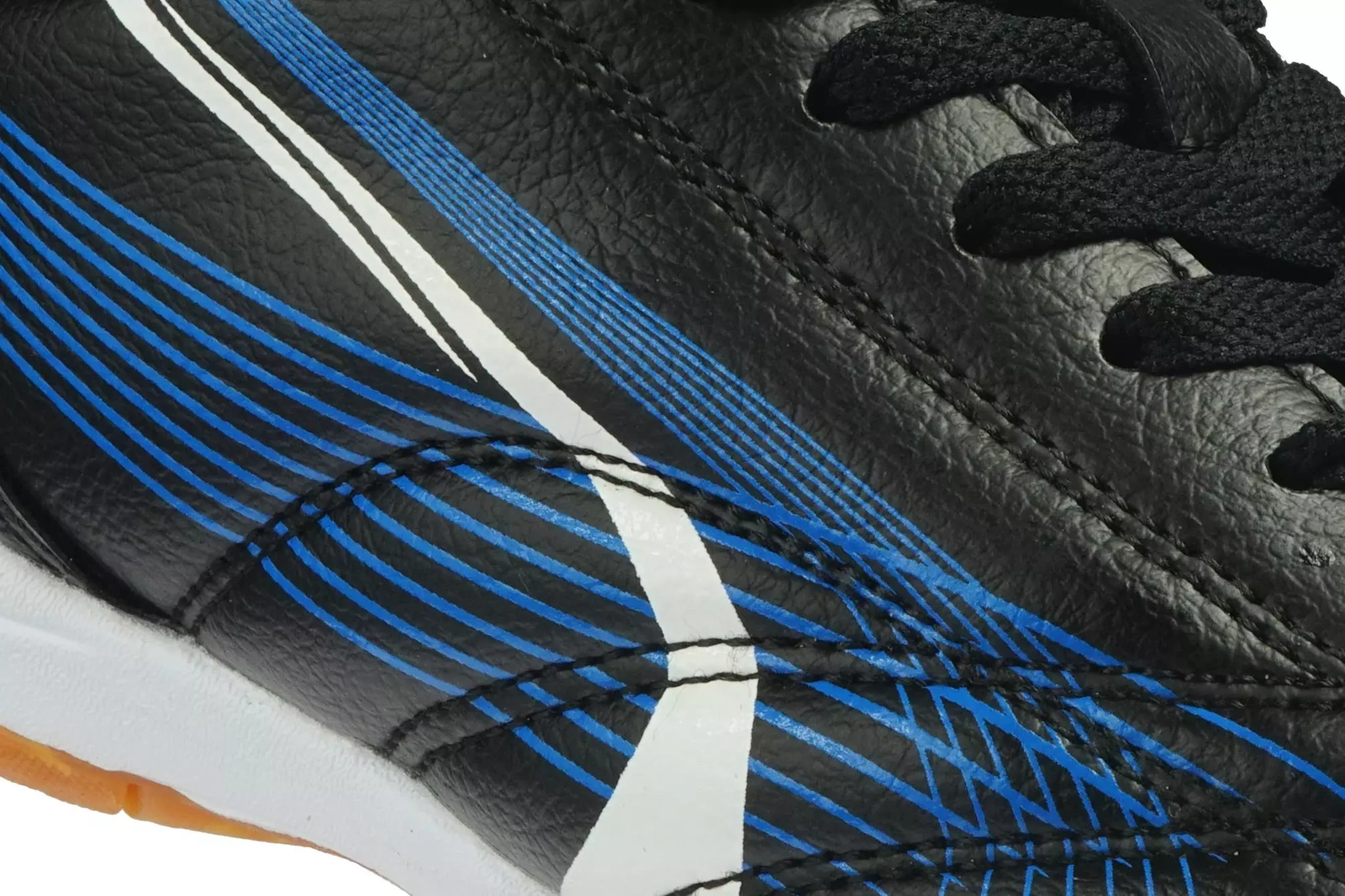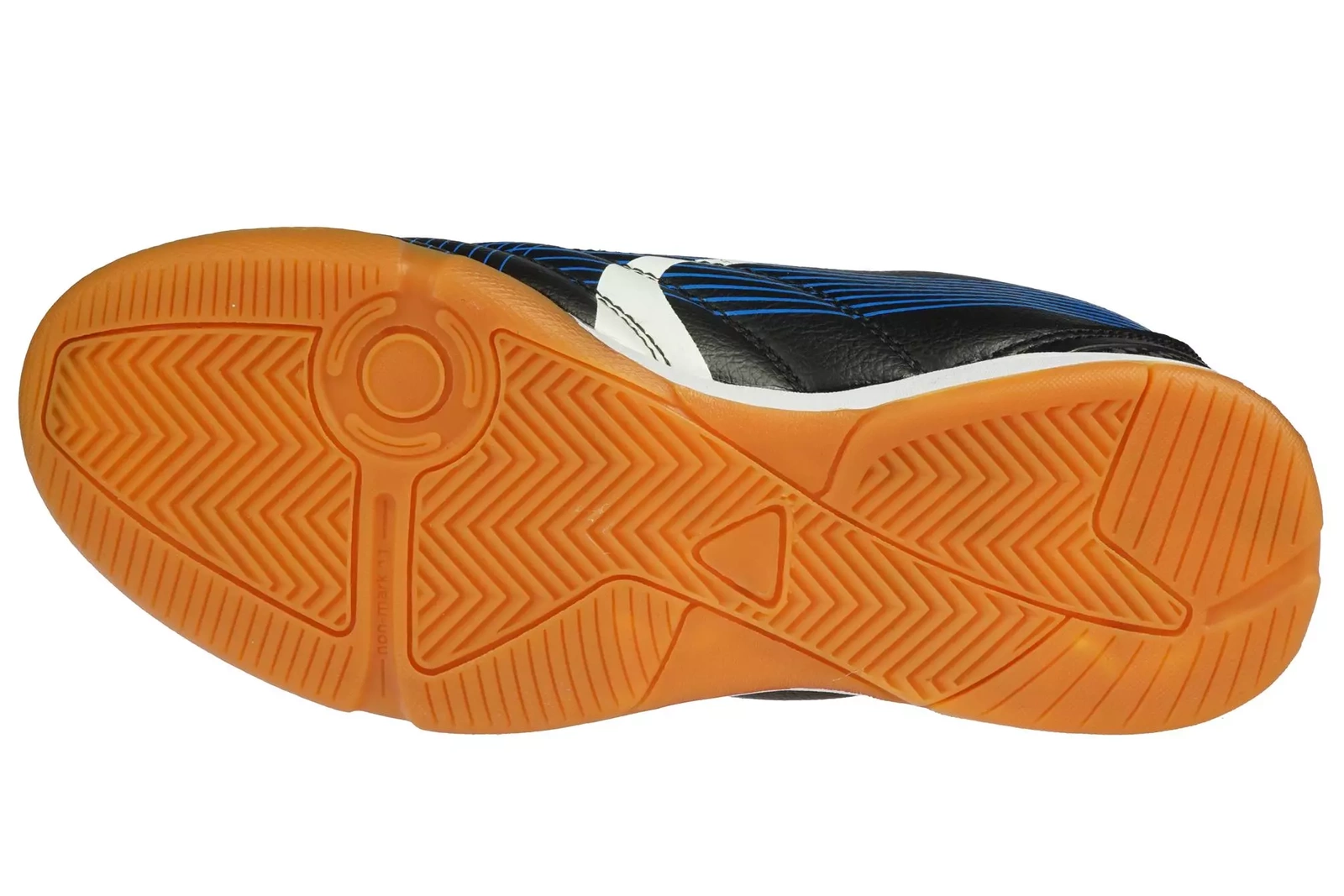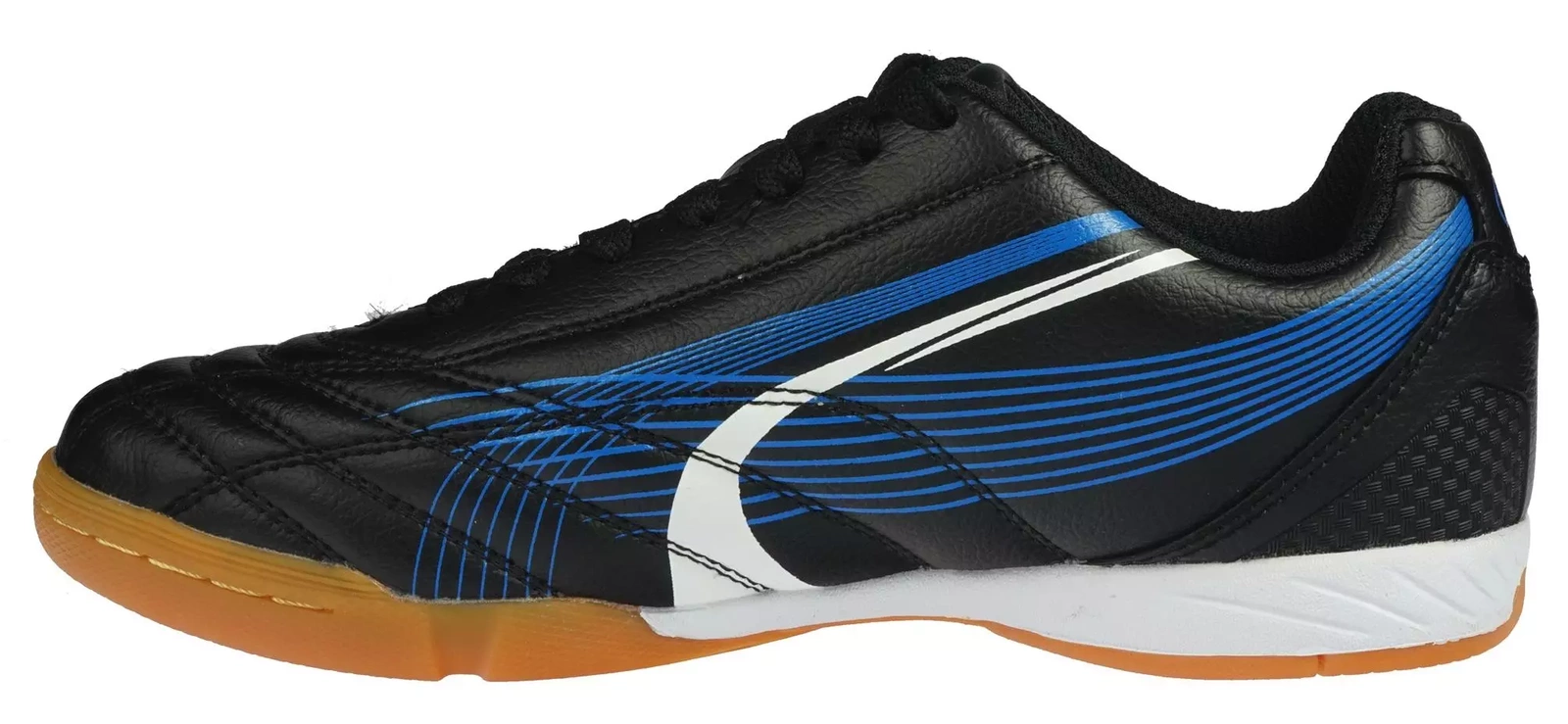 - Męskie obuwie halowe w kolorze czarnym z dodatkiem niebieskiego wykonane z wysokiej jakości materiałów. Gumowa podeszwa zapobiega ślizganiu się, a sznurówki pozwalają na idealne dopasowanie. Cholewka ze skóry ekologicznej zapewnia wygodę.