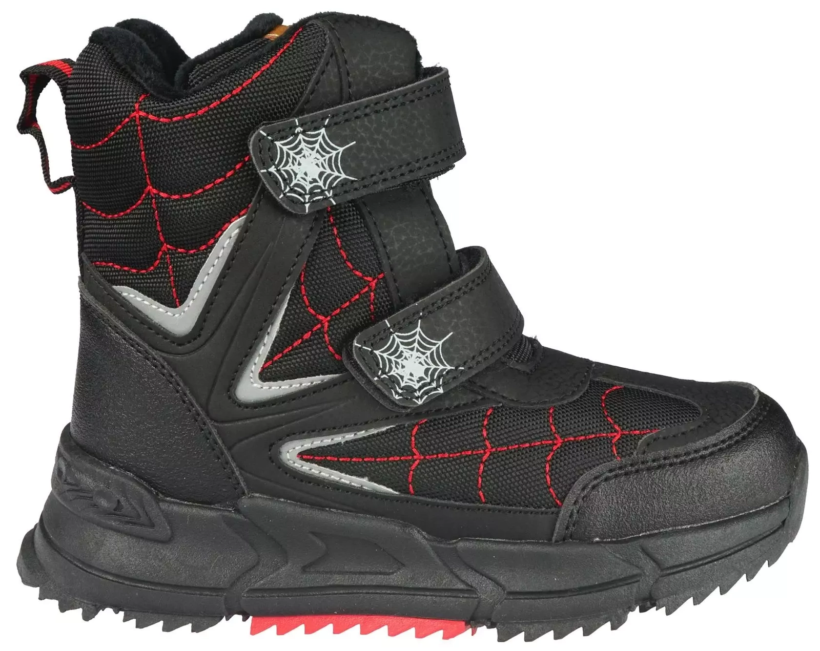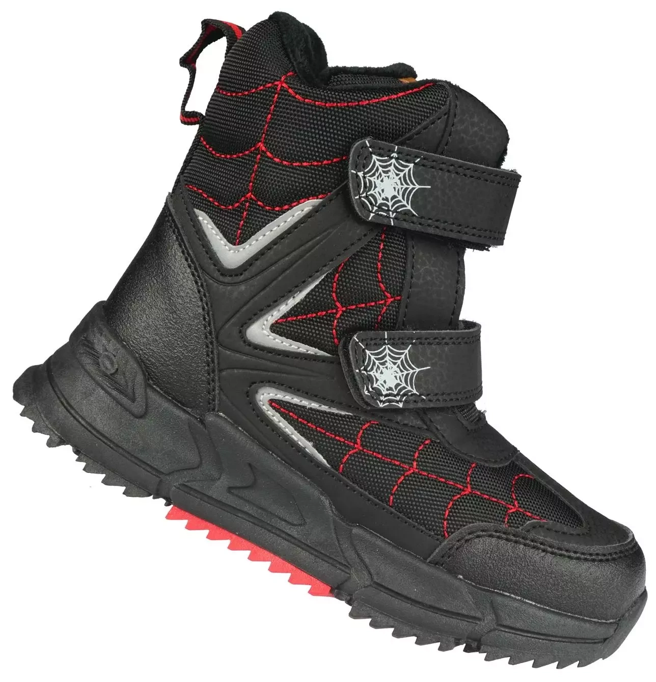 Zimowe buty dziecięce Firmy American Club w kolorze czarnym z przeszyciami i matowymi wykończeniem i czerwonymi elementami w kształcie pajęczyny dodającymi charakteru. Solidnie i starannie wykonane z wysokiej jakości skóry ekologicznej. Gruba podeszwa z bieżnikiem zapewnia dobrą przyczepność do podłoża oraz wygodę użytkowania. Wnętrze buta jest ocieplane co zapewni odpowiednią temperaturę nawet podczas zimowych dni. Zapinane na rzep co ułatwia i przyspiesza zakładanie. Podsumowując, zimowe buty firmy American Club w idealny sposób sprawdzą się w jesienne oraz zimowe dni do codziennego użytku czy też w górskie wyprawy, zapewnią odpowiednią temperaturę, ochronią przed śniegiem. Jest to idealny produkt dla twojej pociechy.