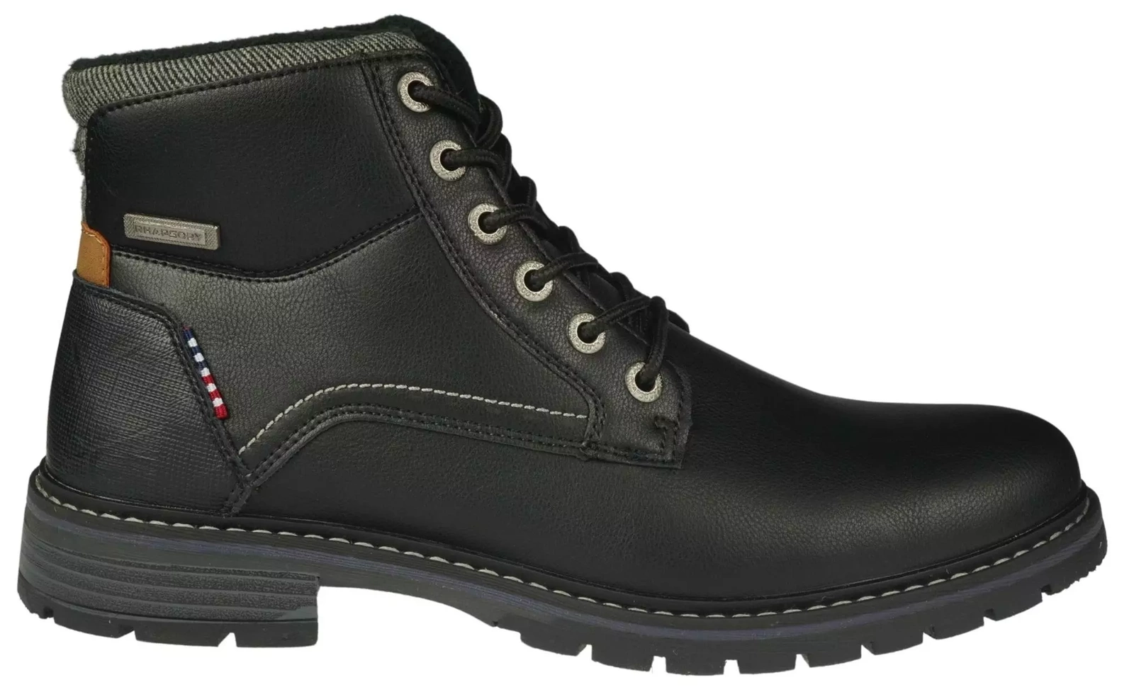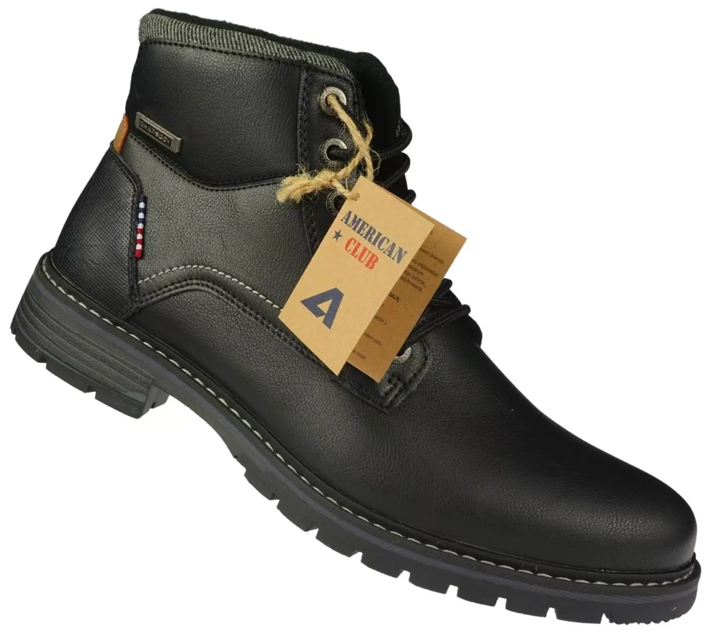 - Zimowe obuwie męskie American za kostkę. Czarna kolorystyka i elegancki styl z połączeniem wysokiej jakości materiałów tworzą idealną propozycję na zimne dni. Buty ocieplane od wewnątrz na grubej podeszwie zapewniają ciepło i wygodę.