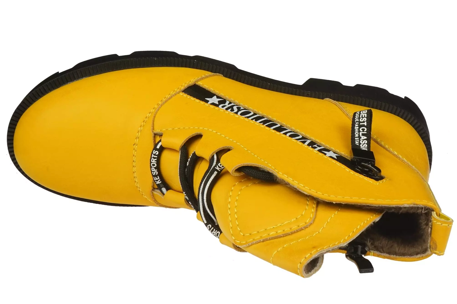 - Żółte ocieplane botki damskie Sergio Leone za kostkę ze skóry ekologicznej. Pomimo imponującej, czarnej, grubej podeszwy, która dodaje charakteru buty nie sprawiają wrażenia masywnych czy ciężkich, a noszenie ich jest niezwykle przyjemne.