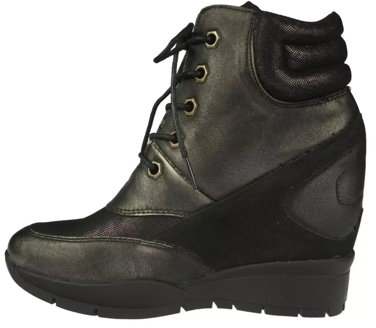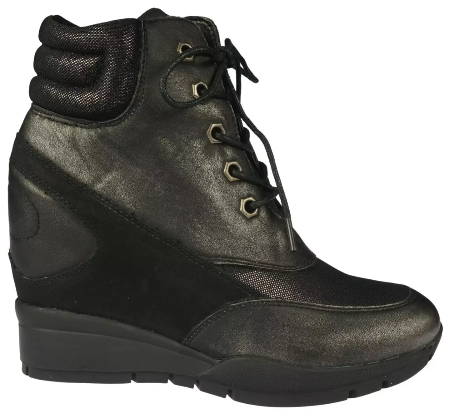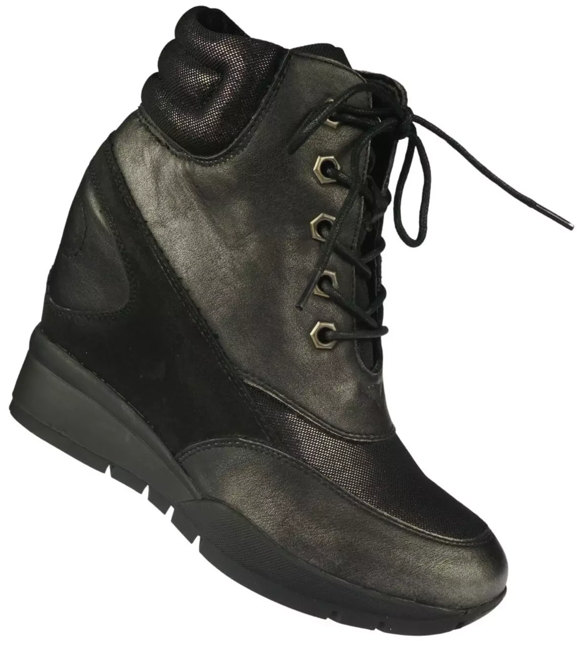 Buty przejściowe Sergio Leone w kolorze czarnym to model, który łączy klasyczną formę trampków z nowoczesnymi akcentami. Metaliczne, świecące wstawki na cholewce dodają im charakteru, wyróżniając się subtelnym połyskiem. Mimo że wyglądają jak zwykłe trampki, skrywają ukryty koturn, który podnosi sylwetkę i optycznie wydłuża nogi. Tkanina wewnątrz buta zapewnia komfort termiczny, chroniąc przed zimnem.