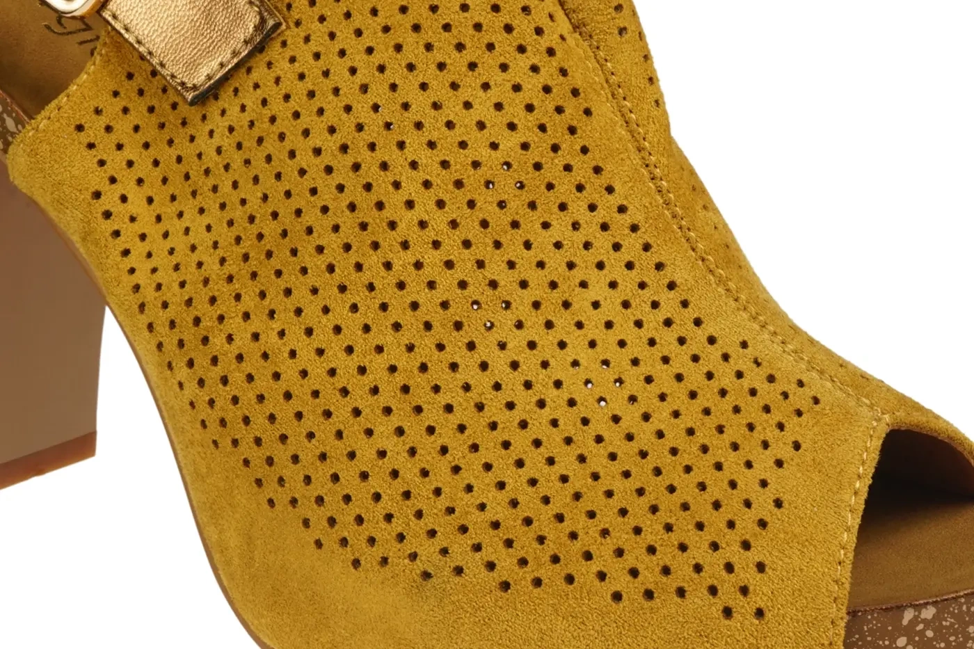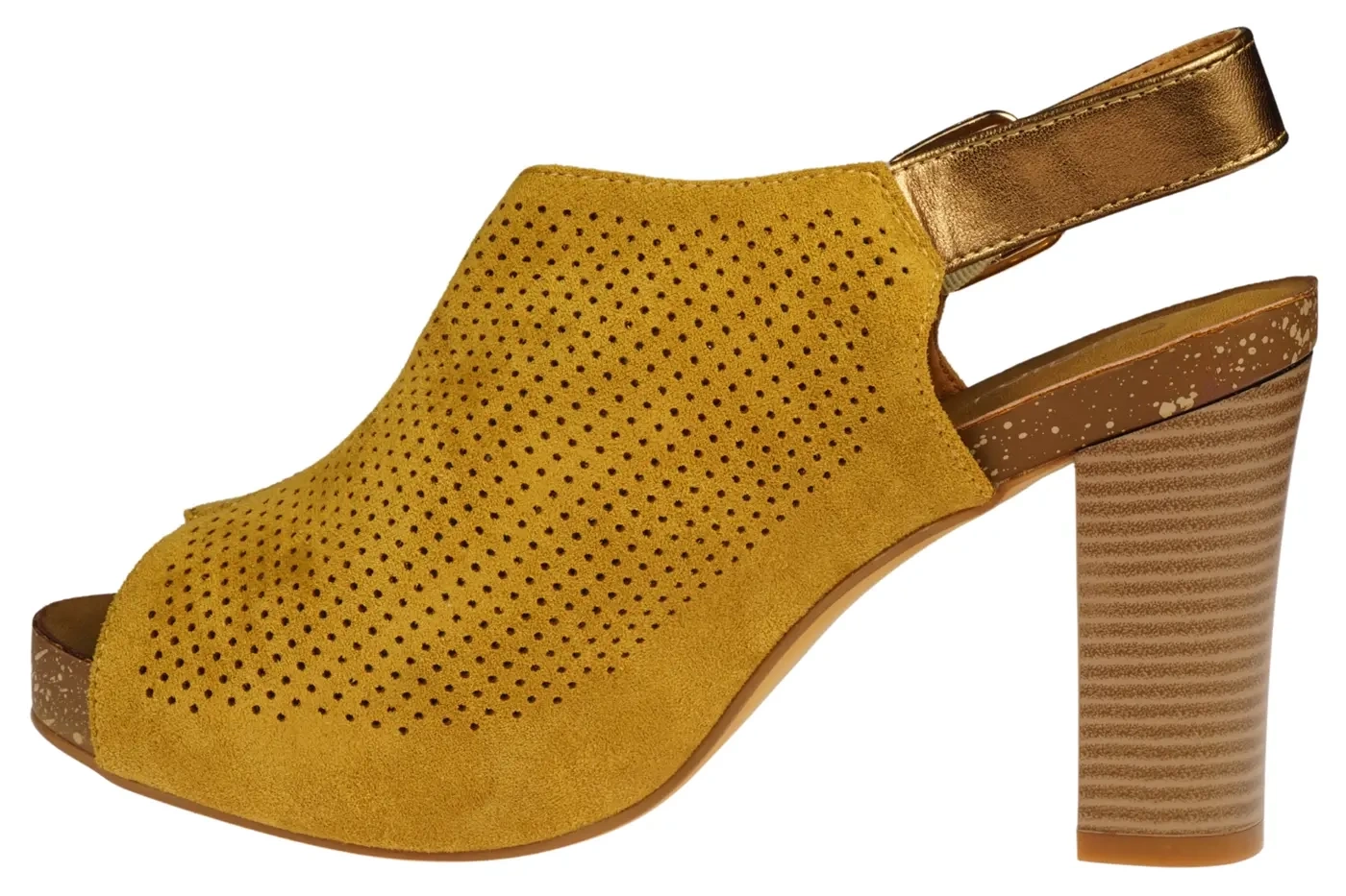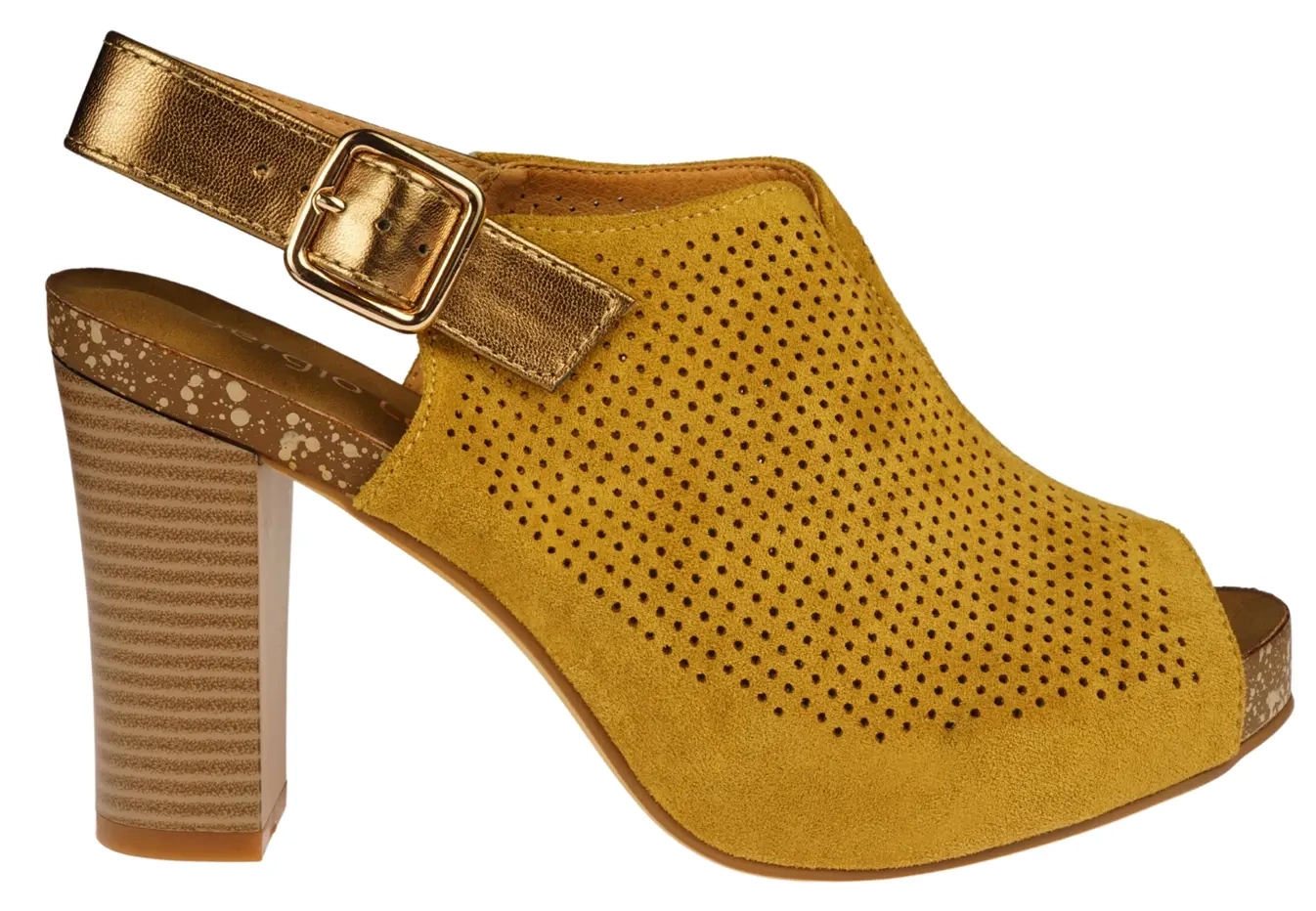 - Musztardowe damskie sandały Sergio Leone. Idealny wybór dla osób ceniących funkcjonalność, wygodę i elegancki design. Doskonale dopasowane, są praktyczne i nadają się na każdą okazję. Sandały posiadają obcas i wykonane są ze skóry ekologicznej.