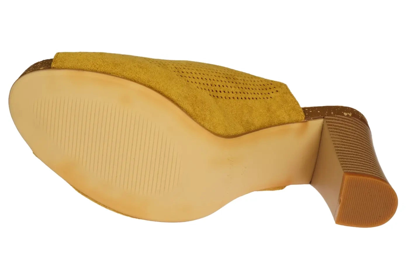 Eleganckie damskie sandały w musztardowym kolorze, z podeszwą i klockiem w kolorze brązu. Wykonane przez firmę Sergio Leone. Obuwie stworzone zostało z wysokiej jakości skóry ekologicznej zamszowej od strony zewnętrznej. Natomiast środek wykonany ze skóry naturalnej. Ten wzór to najnowszy krzyk mody. Sandałkom damskim charakteru dodaje gruby obcas klockowy, który jest wygodniejszy od standardowej szpilki. Wkładka wykonana została ze skóry naturalnej która gwarantuje mega wygodę. Poprzez zastosowanie wyżej opisanych materiałów buty zapewniają bardzo dobre dopasowanie się do stopy, zapobiegają obtarciom. Sandały idealne na co dzień, ale i na specjalne okazje czy do dopełnienia stylizacji.