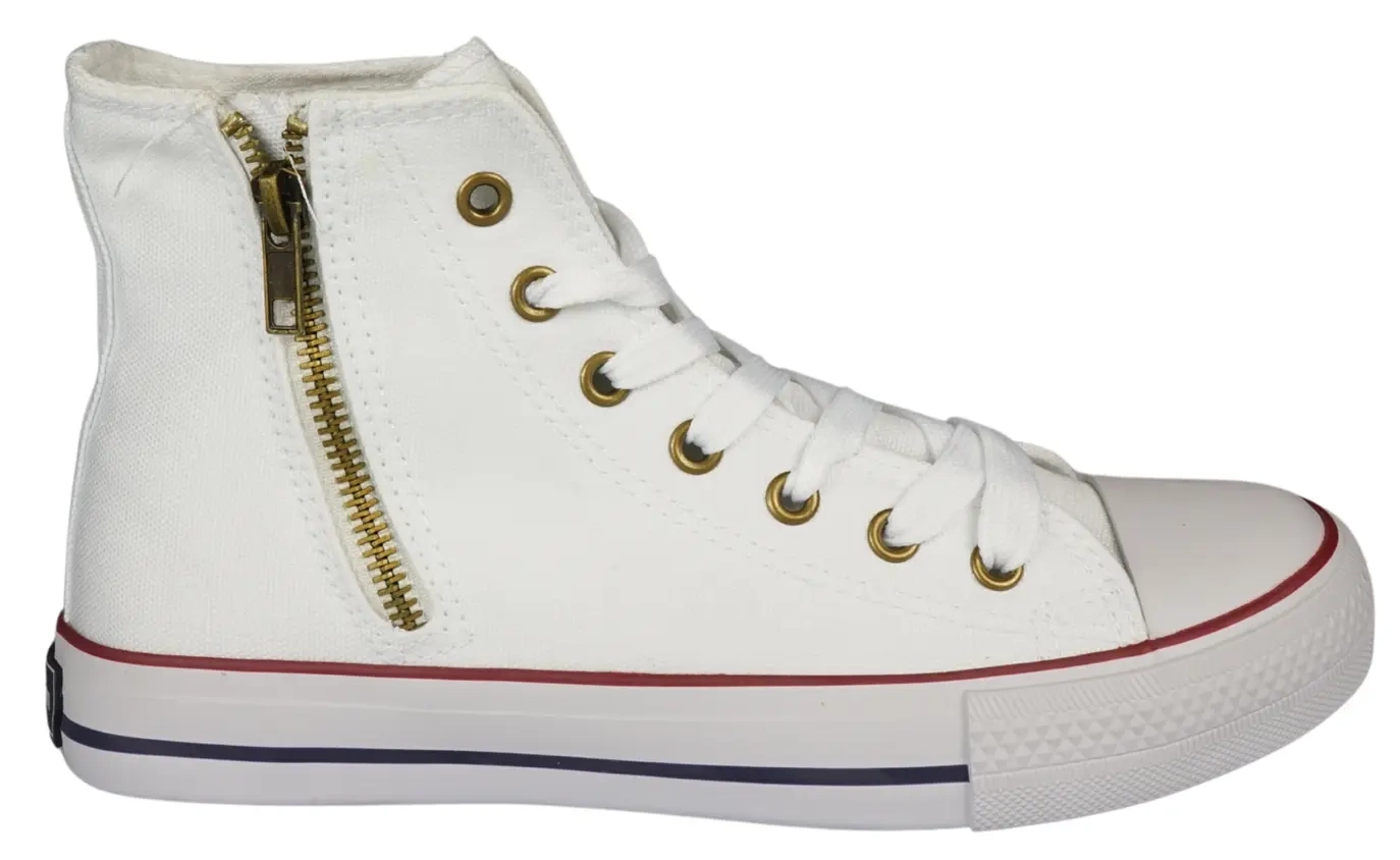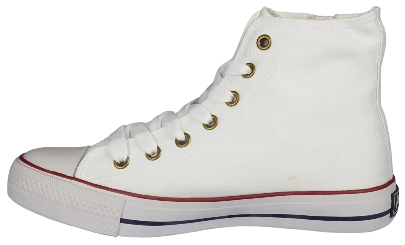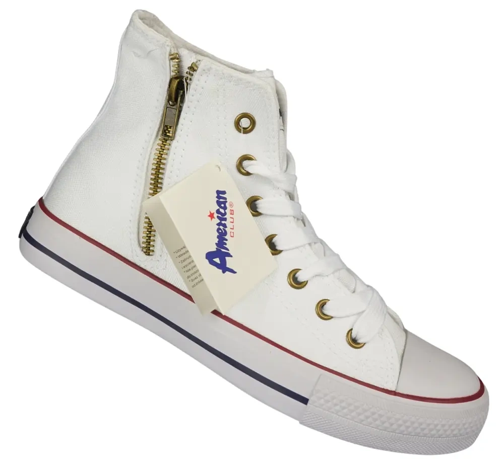 Wysokie tenisówki młodzieżowe w kolorze białym, których producentem jest firma American Club. Zostały wykonane z materiałów tekstylnych o bardzo wysokiej jakości, model jest solidny, schludnie wykonany i dobrze leży na nodze. Buty posiadają grubą, gumową podeszwę co zapewnia im trwałość i bardzo dobrą przyczepność do podłoża. Wnętrze jest bardzo delikatne i przyjazne dla skóry dzięki czemu noga się nie męczy nawet po korzystaniu z nich przez dłuższy czas. Tenisówki te są lekkie i wygodne. Obuwie jest usztywnione na pięcie posiada zamek który ułatwia zakładanie oraz wzmocniony przód. Potrzebujesz obuwia do pracy? Do szkoły? Po prostu do użytku na co dzień? Ten model jest stworzony dla ciebie.