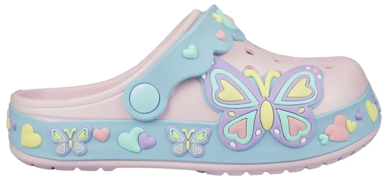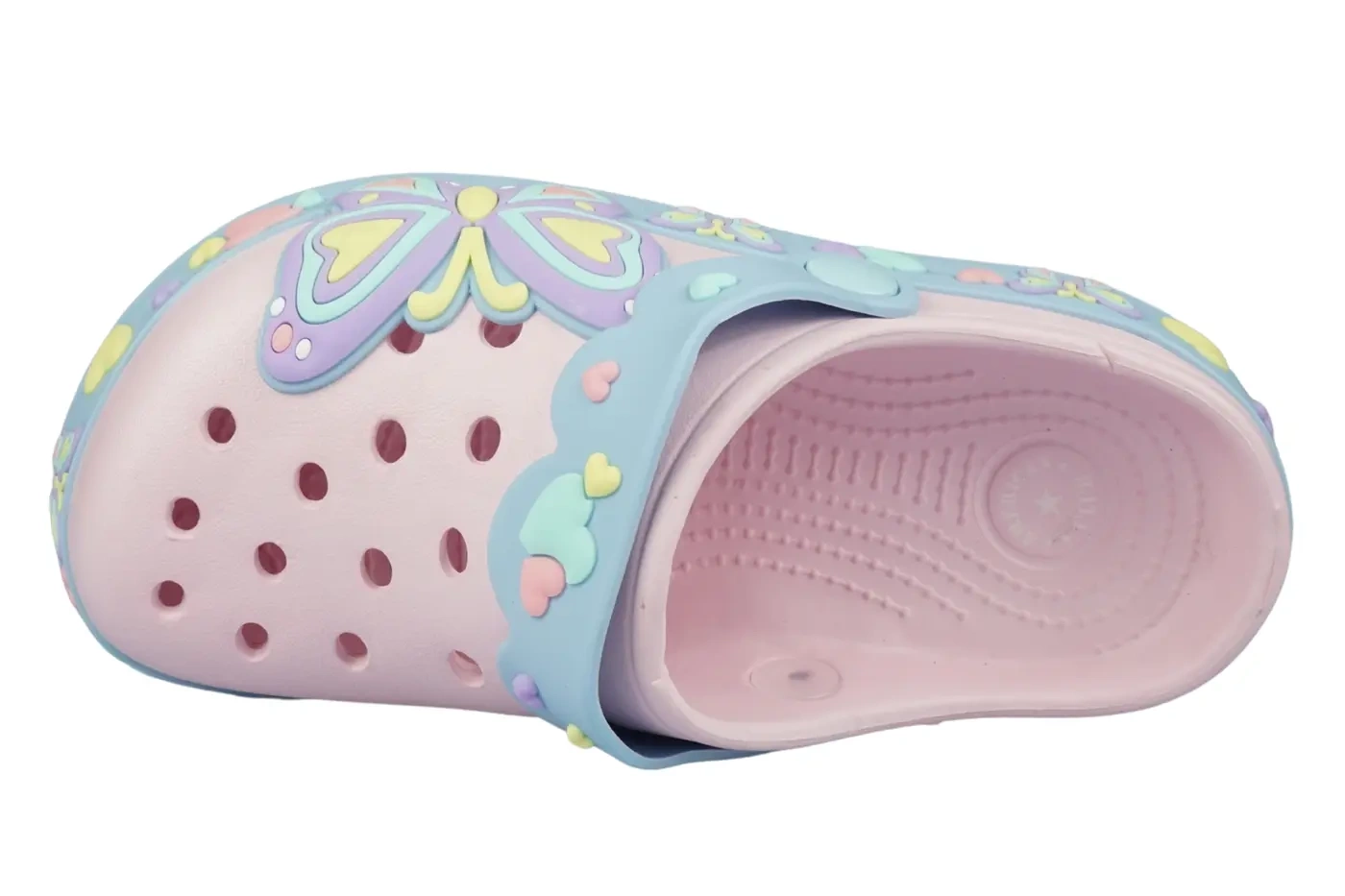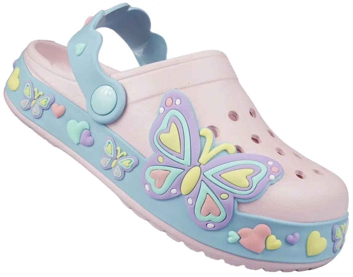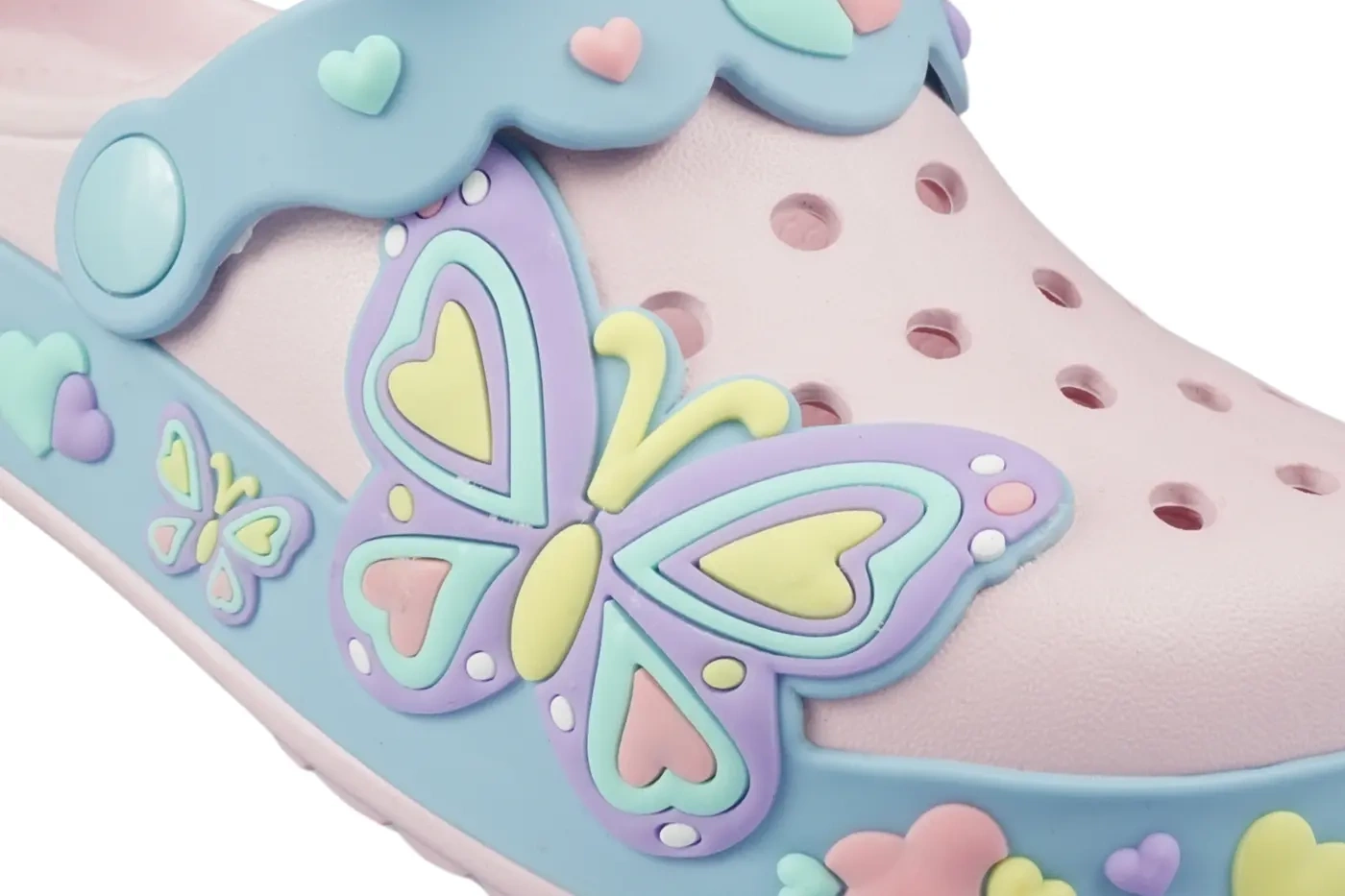 Motylkowy wzór i różowy kolor sprawiają, że klapki wizualnie wyróżniają się na tle klasycznego obuwia dziecięcego. Ich stylistyka została zaprojektowana z myślą o najmłodszych użytkownikach – pogodna, radosna estetyka zachęca do noszenia i wprowadza wakacyjny klimat.