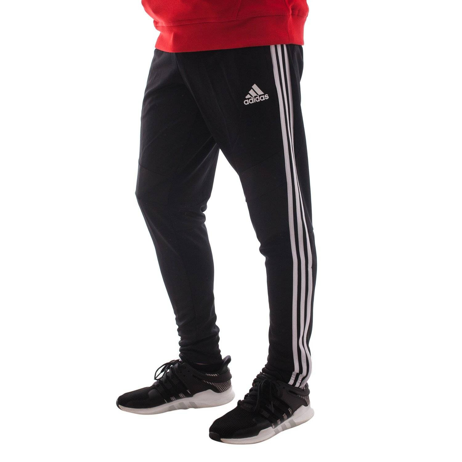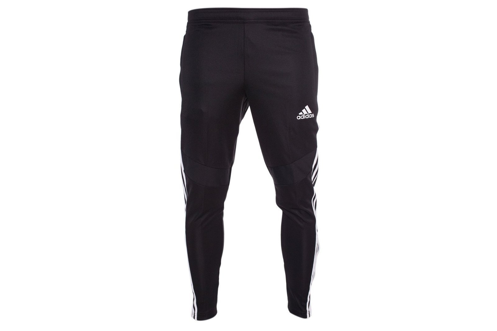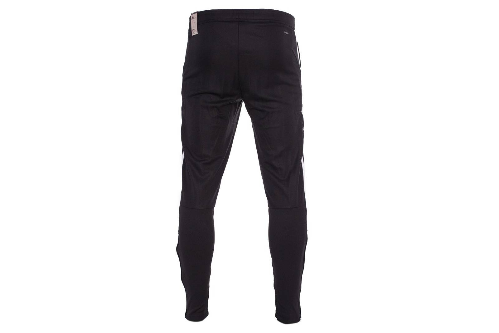 Spodnie dresowe męskie w kolorze czarnym marki Adidas z serii Tiro 19 wykonane w 100% z najwyższej jakości poliestru wyposażone są w technologię Climacool, która pomaga zachować świeżość skóry na dłużej dzięki redukcji ilości potu, odprowadzeniu go na zewnątrz materiału i wentylacji. Dedykowane są przede wszystkim aktywnie spędzającym czas mężczyznom, ponieważ są wygodne, zapewniają swobodę ruchu i komfort podczas użytkowania, dlatego świetnie nadają się na siłownię, na treningi na boisku, do biegania czy jazdy na rowerze. Krój spodni dresowych sprawia, że dopasują się one do każdego typu sylwetki. Dwie boczne zasuwane na zamek błyskawiczny kieszenie umożliwiają przechowywanie drobiazgów. Białe logo znajduje się na lewym udzie. Zwężane nogawki z zamkiem w dolnej części zapobiegają samoistnemu podwijaniu się. Wstawki w postaci trzech charakterystycznych dla firmy Adidas białych pasków umiejscowionych na nogawkach dodają spodniom stylu i gwarantują o autentyczności modelu. Ściągacz ze sznurkami w pasie zapewnia stabilność. Produkt jest nowy i posiada oryginalne metki.