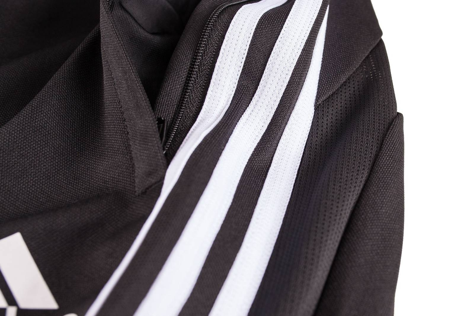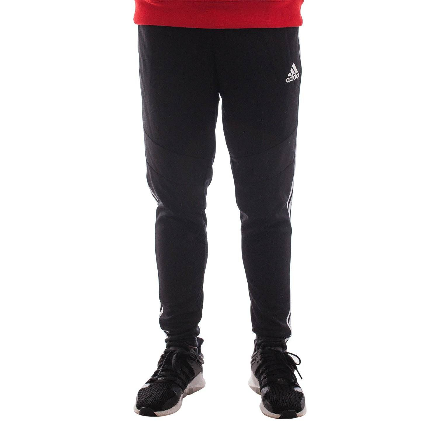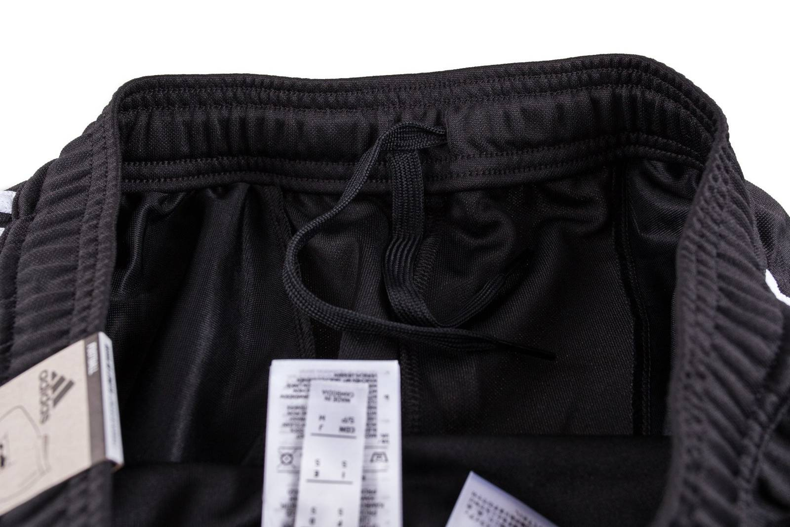 Spodnie dresowe męskie w kolorze czarnym marki Adidas z serii Tiro 19 wykonane w 100% z najwyższej jakości poliestru wyposażone są w technologię Climacool, która pomaga zachować świeżość skóry na dłużej dzięki redukcji ilości potu, odprowadzeniu go na zewnątrz materiału i wentylacji. Dedykowane są przede wszystkim aktywnie spędzającym czas mężczyznom, ponieważ są wygodne, zapewniają swobodę ruchu i komfort podczas użytkowania, dlatego świetnie nadają się na siłownię, na treningi na boisku, do biegania czy jazdy na rowerze. Krój spodni dresowych sprawia, że dopasują się one do każdego typu sylwetki. Dwie boczne zasuwane na zamek błyskawiczny kieszenie umożliwiają przechowywanie drobiazgów. Białe logo znajduje się na lewym udzie. Zwężane nogawki z zamkiem w dolnej części zapobiegają samoistnemu podwijaniu się. Wstawki w postaci trzech charakterystycznych dla firmy Adidas białych pasków umiejscowionych na nogawkach dodają spodniom stylu i gwarantują o autentyczności modelu. Ściągacz ze sznurkami w pasie zapewnia stabilność. Produkt jest nowy i posiada oryginalne metki.