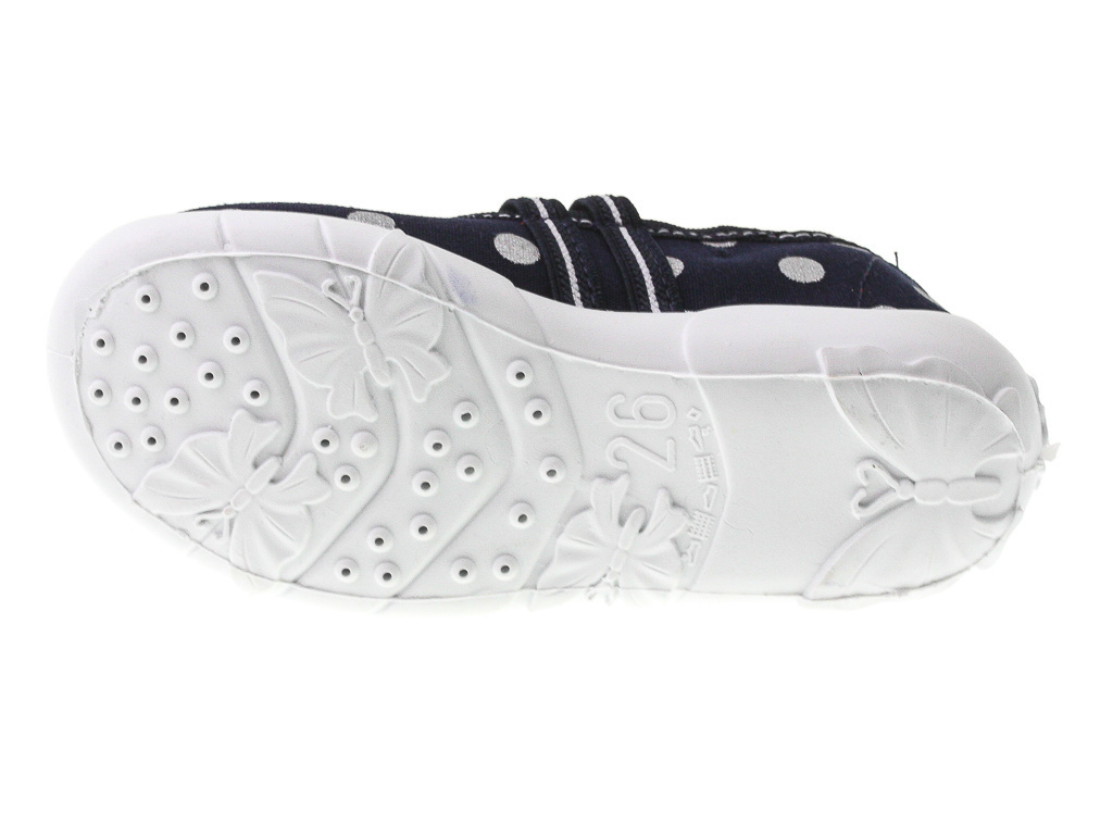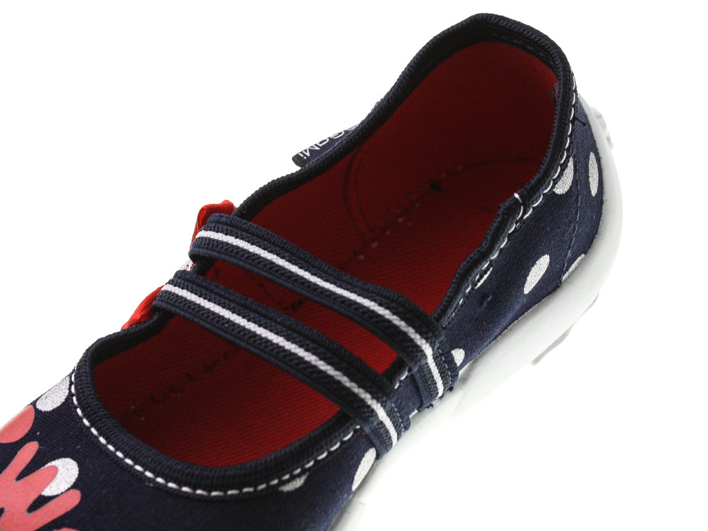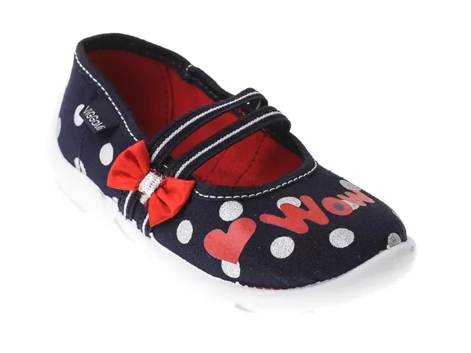 - Tenisówki dziecięce Viggami w granatowym kolorze z ciekawym wzorkiem i kokardką. Kapcie są wsuwane co znacznie ułatwia samodzielne zakładanie obuwia przez dziecko. Posiadają certyfikat zdrowej stopy.