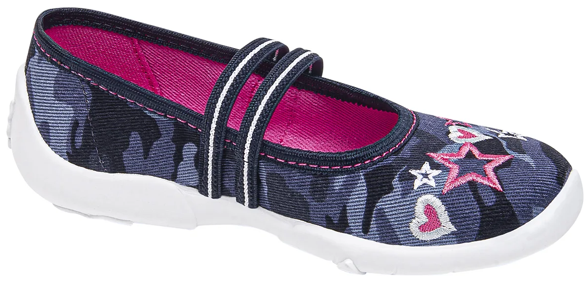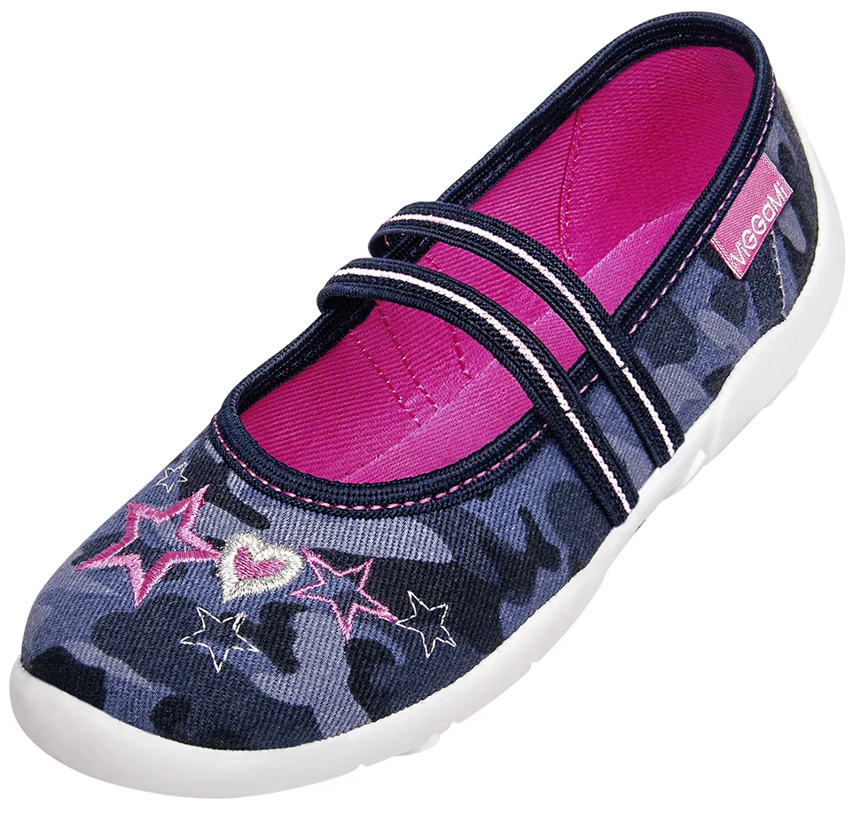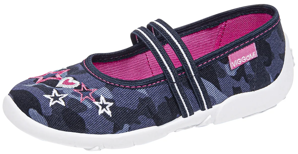 • Tenisówki dziecięce Viggami w granatowym kolorze z harfowanym wzorem w gwiazdki. Kapcie są wsuwane co znacznie ułatwia samodzielne zakładanie obuwia przez dziecko. Posiadają certyfikat zdrowej stopy.
