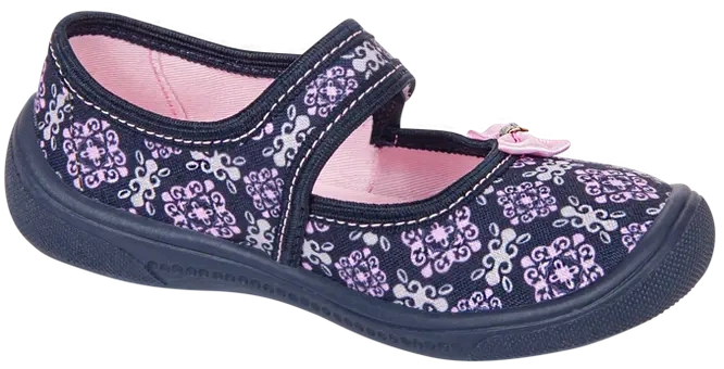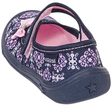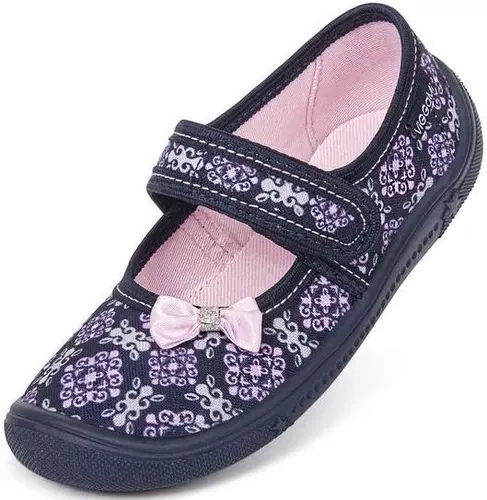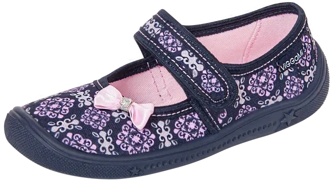 • Tenisówki dziecięce Viggami w granatowym kolorze z ciekawym wzorkiem i kokardką. Kapcie są zapinanie na rzep co znacznie ułatwia samodzielne zakładanie obuwia przez dziecko. Posiadają certyfikat zdrowej stopy.