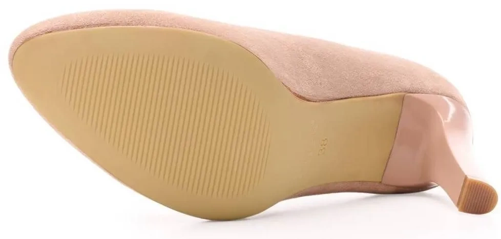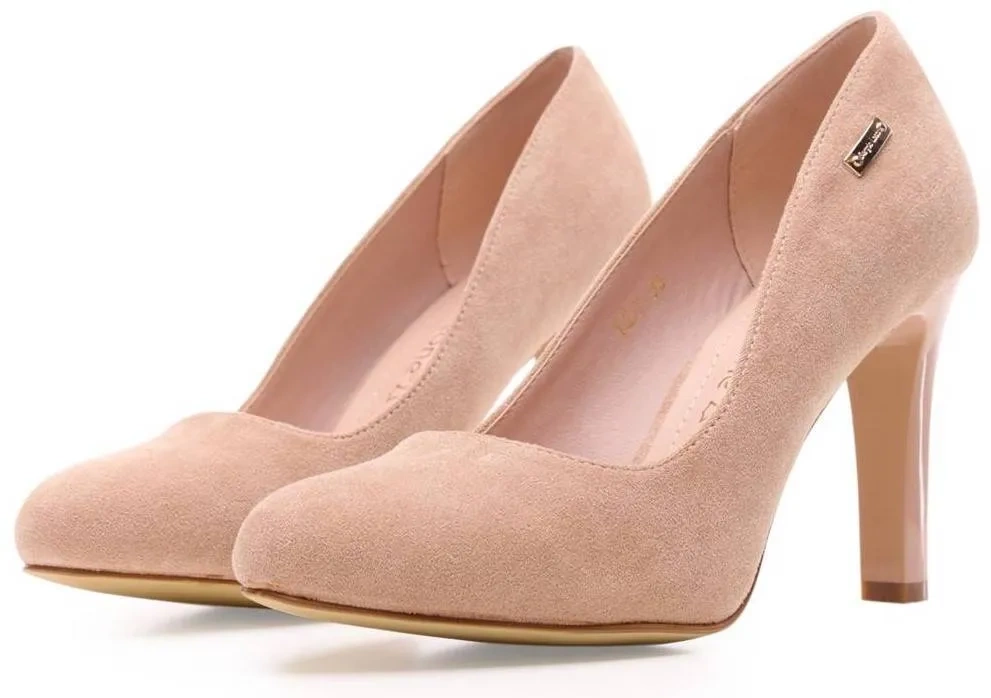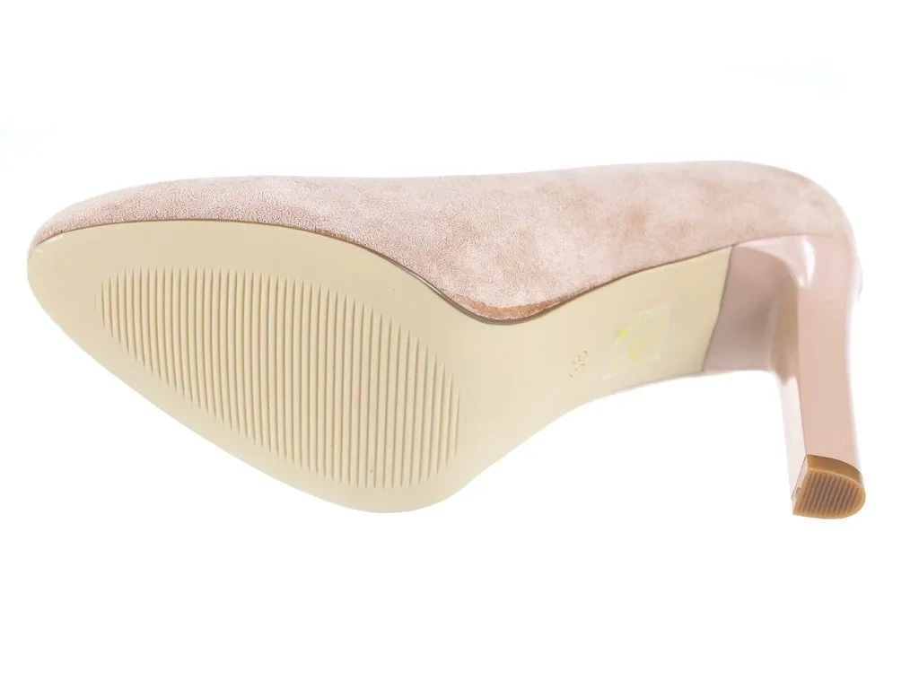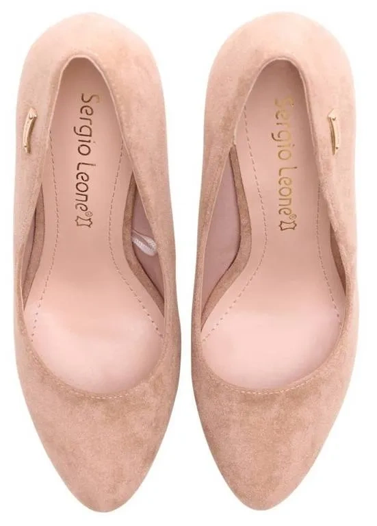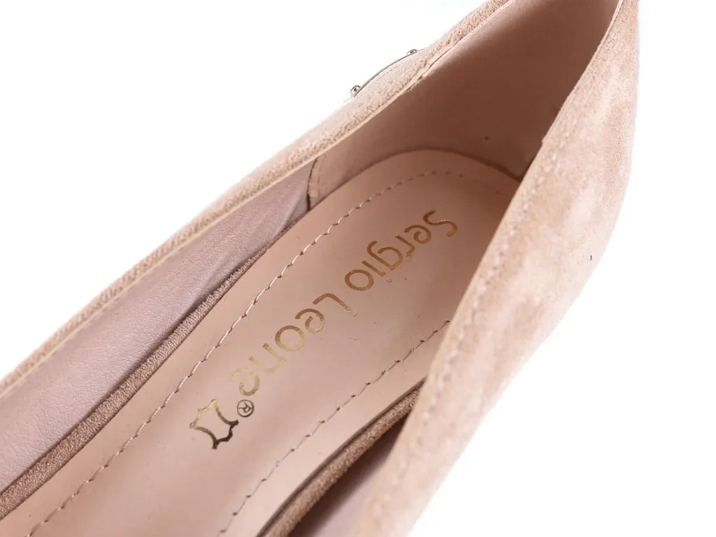 Czółenka damskie firmy Sergio Leone w beżowym kolorze i bardzo subtelnym wykończeniem. Obuwie wykonane z wyjątkową starannością z najwyższej jakości materiałów, gwarantuje nie tylko elegancki wygląd, ale również wygodę noszenia. Cholewka została wykonana z zamszowej skóry ekologicznej w modnym, neutralnym beżowym kolorze, który doskonale komponuje się z różnorodnymi stylizacjami – zarówno codziennymi, jak i bardziej eleganckimi.