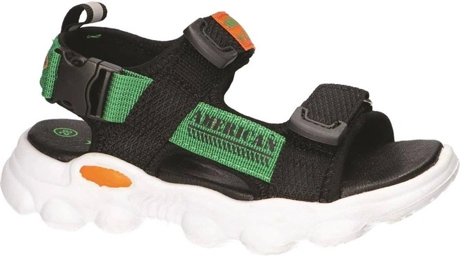 - Czarne sandały dziecięce American Club z zielonymi akcentami – lekkie, przewiewne i wygodne. Tekstylny materiał, skórzana wkładka, rzepy i piankowa podeszwa. Idealne na lato i codzienne aktywności.
