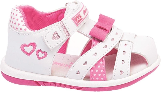 - Białe sandały dziecięce American Club z kwiatkami i serduszkami – lekkie, przewiewne i wygodne. Skóra ekologiczna, rzepy, gumowa podeszwa i skórzana wkładka. Idealne na lato i codzienne noszenie.