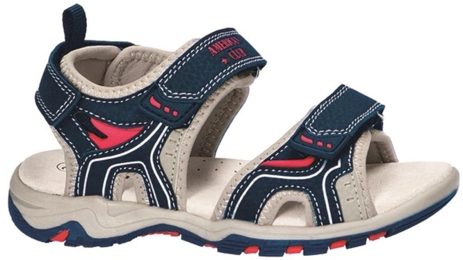 - Dziecięce sandały American Club w granatowym kolorze z czerwonymi akcentami. Wygodne, lekkie, z profilowaną wkładką i rzepami dla łatwego zakładania. Idealne na lato – bezpieczne i przewiewne.