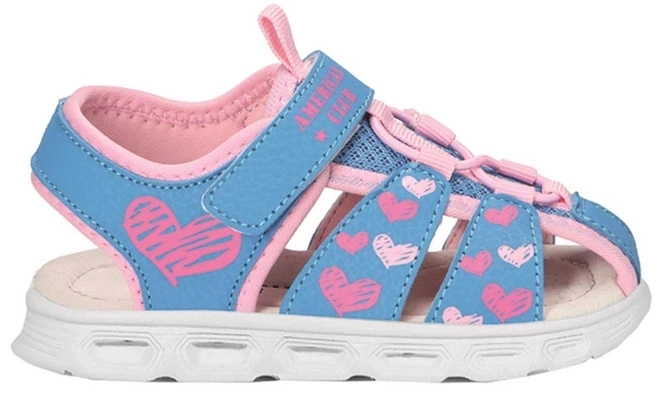 Sandały dziecięce American Club w niebiesko-różowym kolorze, ozdobione dekoracyjnymi serduszkami Wykonane z wysokogatunkowej skóry ekologicznej oraz materiałów tekstylnych, skutecznie chronią przed otarciami i podrażnieniami. Wewnątrz znajduje się wkładka ze skóry naturalnej, która zwiększa wygodę użytkowania oraz wspiera prawidłowy rozwój stopy dziecka. Zapięcia na rzep umożliwiają precyzyjne dopasowanie do stopy oraz ułatwiają samodzielne zakładanie obuwia przez najmłodszych. Gumowa, płaska podeszwa zapewnia dobrą przyczepność i chroni przed poślizgnięciem. Obuwie jest przewiewne, a zabudowany przód zabezpiecza palce przed urazami. Idealny wybór na lato do codziennego użytku i aktywnej zabawy.