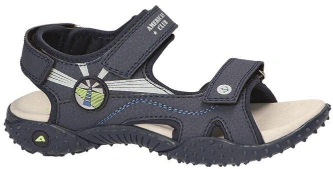- Dziecięce sandały American Club w granatowym kolorze z szarymi akcentami. Wygodne, lekkie, z profilowaną wkładką i rzepami dla łatwego zakładania. Idealne na lato – bezpieczne i przewiewne.