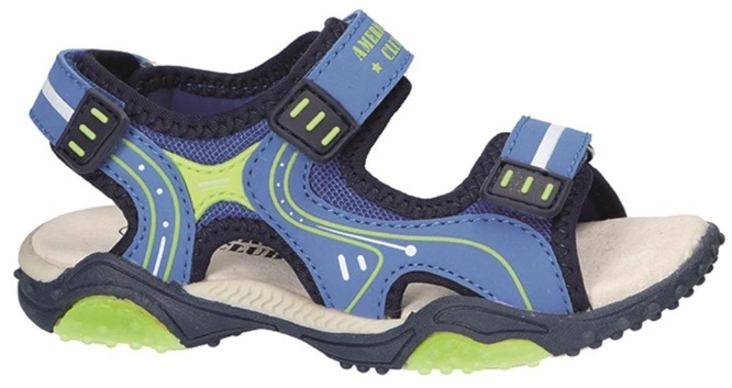 - Niebieskie sandały dziecięce American Club z seledynowymi dodatkami. Lekkie, wygodne, z rzepami i profilowaną wkładką. Idealne na lato – do zabawy, spacerów i codziennego użytku.
